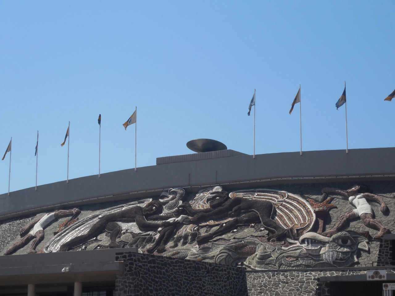 メキシコ国立自治大学に行ったときにインスルヘンテス通りを挟んだ向かいにあったので、ついでに見学してきました。大学の地下道を抜けるとスタジアム側に行けます。1968年のメキシコ・オリンピックでメイン会場となった場所で正面入り口の上にはディエゴ・リベラ(1886~1957)の壁画がありますが、立体的なので上手に写真を撮るのが」非常に難しく道路脇の壁によじ登って何とか撮影できました。