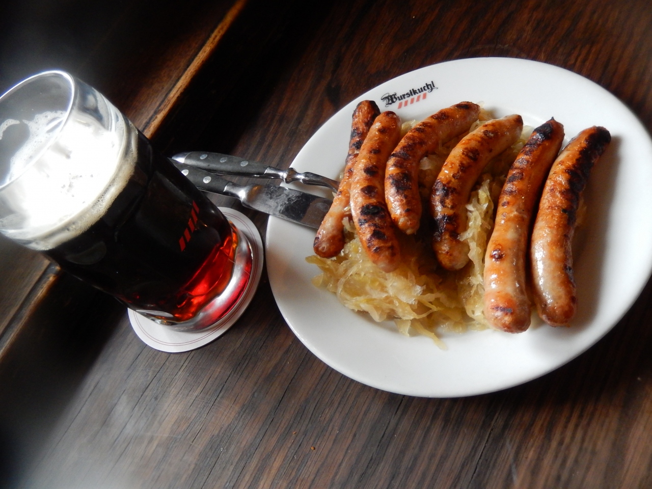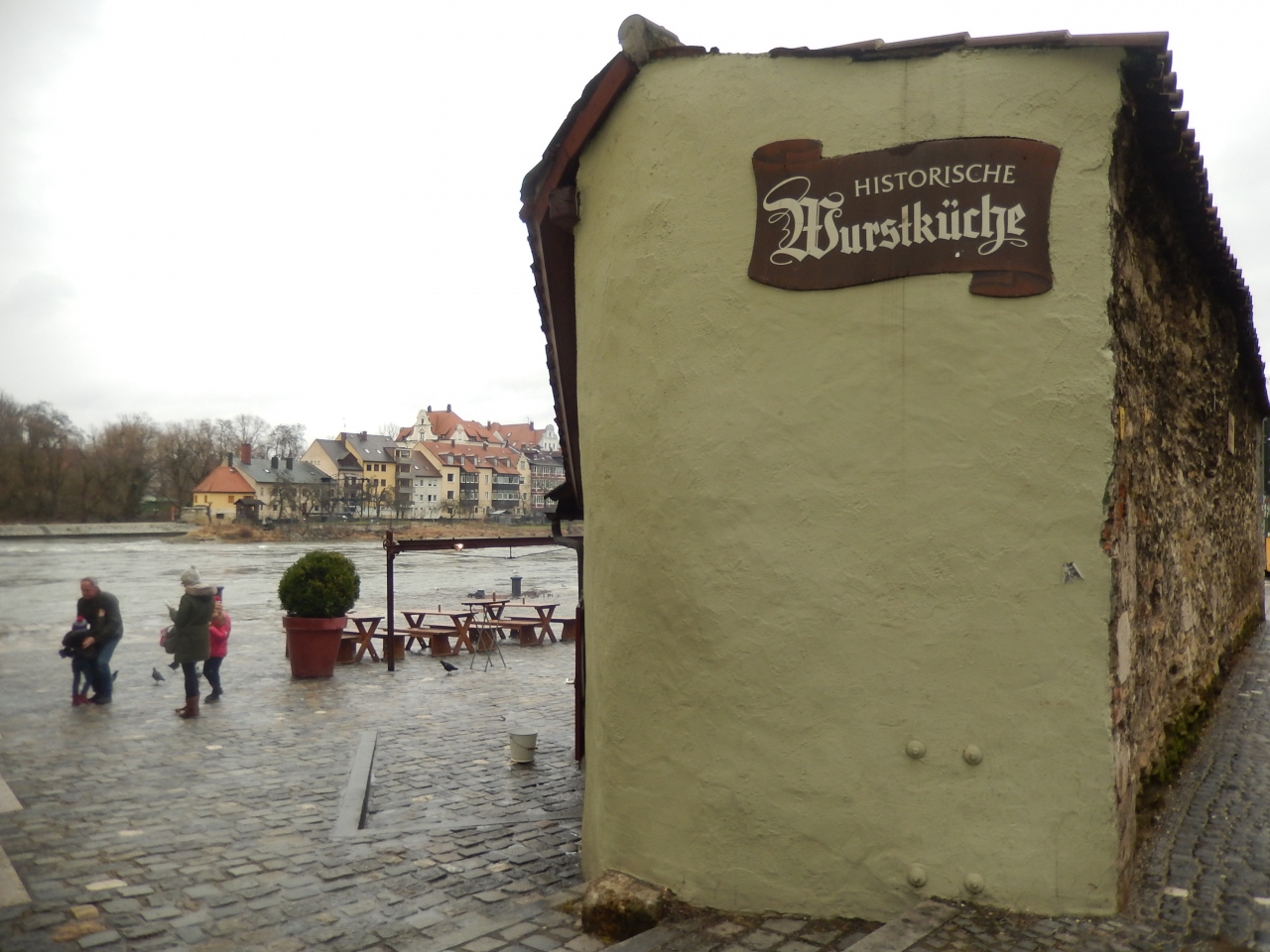 ドイツ最古の石橋のそばにある店で、その名も「歴史的ソーセージの台所」。創業は1135年で、レストランとしても500年以上経つこの店は、ドイツのみならず「世界最古のソーセージ屋」でもあります。石橋の建設に携わった人たちの飯場として誕生し、緑色の石造りの小さな小屋の煙突からは絶えず煙が出ていて、中に入るとすぐ厨房があり、ひっきりなしにソーセージが焼かれています。名物の炭焼きソーセージは6本、8本、10本と選べ、ザワークラウトつき。ビールもあり、寒い日はスープもお薦めです。味はとりたてて感動ものではありませんでしたが、歴史があるものなので是非ご賞味を。中の座席は混んでいても回転が速いので、少し待てば空きます。