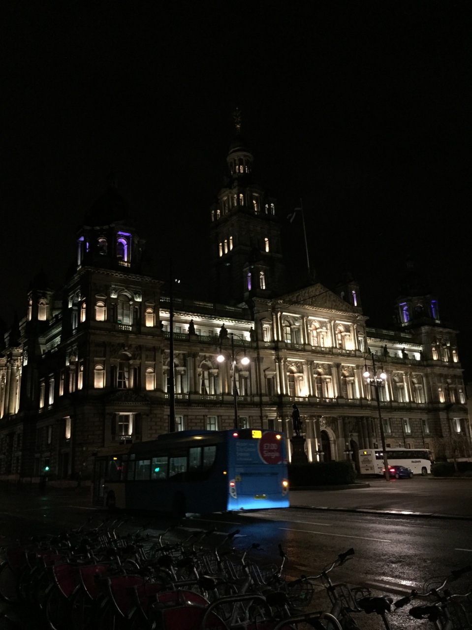 お昼も良いですが、私は夜のジョージスクエアが一番好きです。繁華街と言ってもお店が閉まってしまうと結構この周辺は静かで、ライトアップされた建物がとても幻想的で美しかったです。