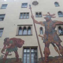 13世紀に建てられた貴族の家の壁に、大きな絵が描かれています。旧約聖書のサムエル記にある巨人ゴリアテとダビデの戦いをモチーフにして16世紀に描かれたもので、実に見事な絵です。風雨にさらされながらも、色彩もきれいに残っています。この家が建つ通りはその名もゴリアテ通り。通りのアクセントになっていて、道行く人を楽しませてくれます。