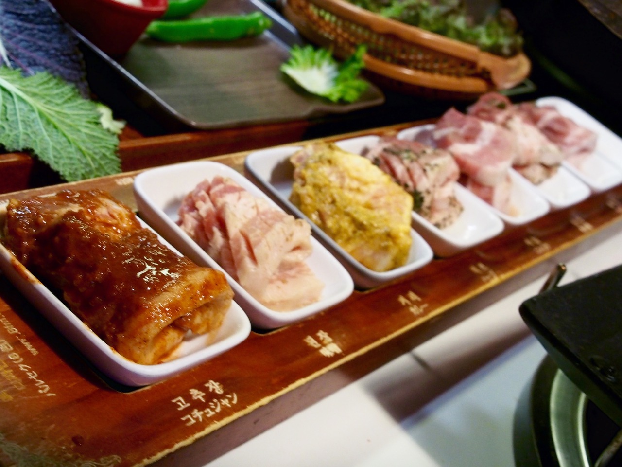 メニューは大変シンプルですぐに8種類の各味付けのサムギョプサルを焼いてくれます。
