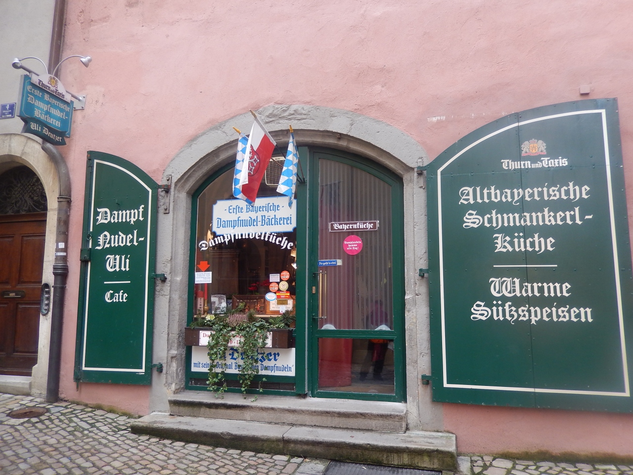 ダンプフヌーデルは、南ドイツ名物のドイツ版蒸しパンのこと。ミルクと油で蒸し焼きしたふわふわのパンに温かいバニラソースをたっぷりかけたもので、ボリュームたっぷりの甘いデザートです。ここは店名通り、ウーリさんが作るダンプフヌーデルの店で、店内には有名人の写真&サインがたくさん飾られていて、そのことからも人気店だとわかります。バウムブルガー・トゥルムという赤い塔の1階にあって、店構えもかわいいです。
