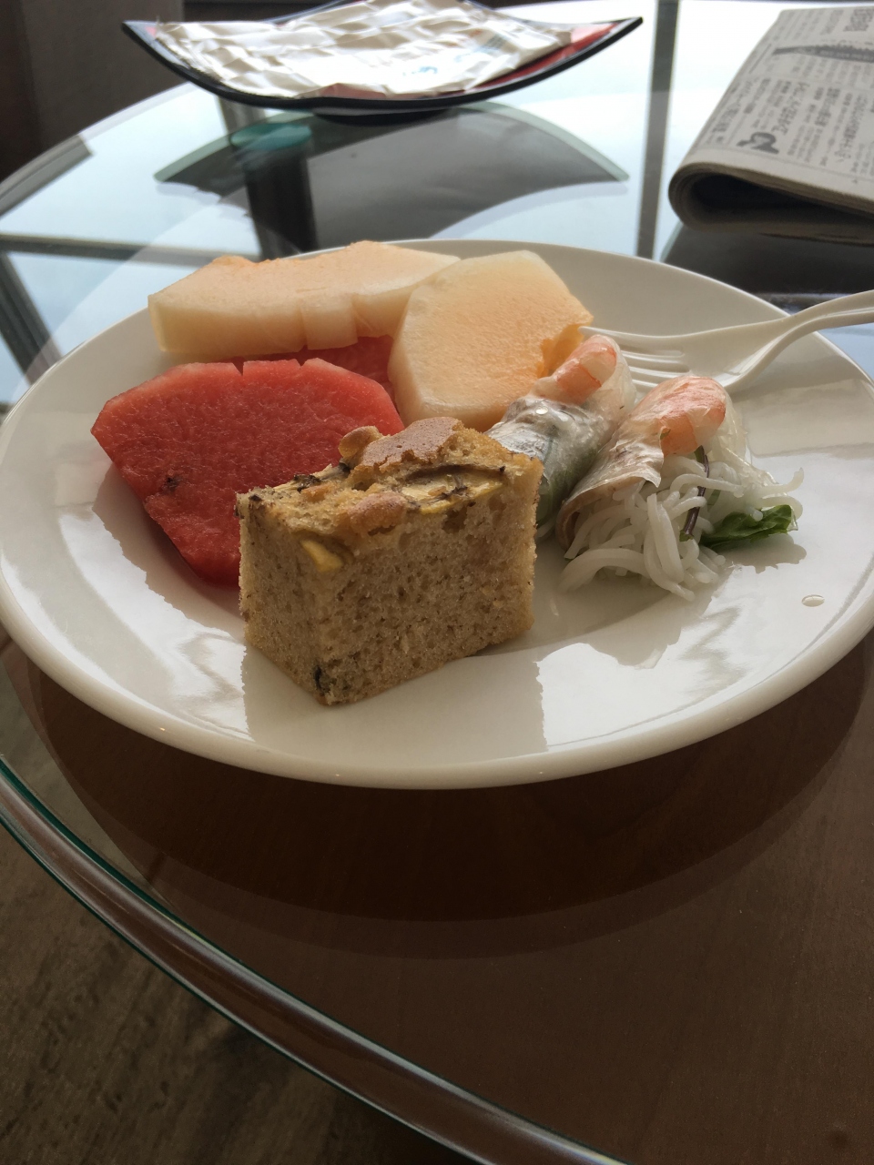 中はとても広々としてソファー席のエリアやテーブルとイスのエリアなどに分かれていてそれほど人はいませんでした。食べ物や飲み物の種類も結構多く、スタッフもてきばきと片づけをしていてとても快適なラウンジでした。