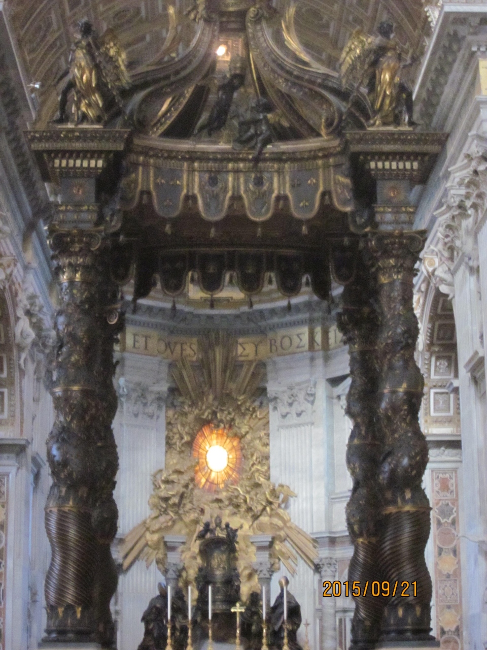 ベルニーニによる作品で、4本のねじれた柱で囲まれた天蓋の真上にはクーポラがあります。