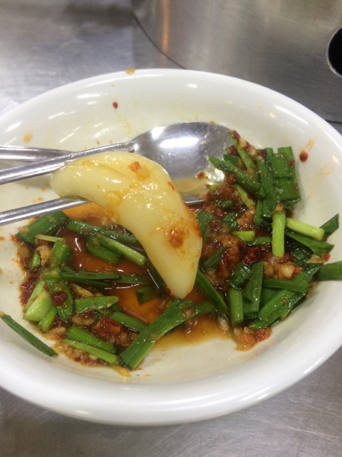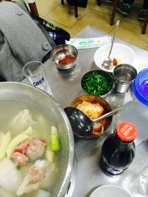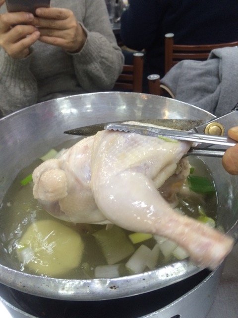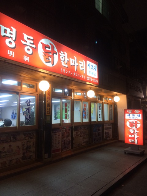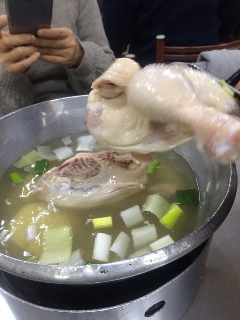 初めてのタッカンマリ体験。事前学習なしで挑んだので色々と衝撃でしたが、結果から言うと大好物のひとつになりました。他の有名店に行く予定でしたが、こちらのお店はちらっと覗いたところ旅行者ゼロ。でも現地の人々美味しそうに食うておる、ということでアジュンマの誘いに誘われるままに中へ。席に座る前に鍋を片手にアジュンマがやってきてコンロにドンっと鳥の鍋を置きました。注文してないけど、やはり話が早いね。。初めて食べると告げるとアジュンマが手際よくタレをミックスしてくれます。生のニラ、ニンニクすりおろし、唐辛子ペースト、タレ2種。味がなんとも言えず絶妙。まず、火の通り易いとっく、次にじゃが、それから鳥肉の順番ね、と身振り手振りで伝えられ、いざ鍋に向き合う二人。まずスープが澄んでいて、なのにとろっとしています。塩辛くなく絶妙に素材の味が楽しめます。疲れた体を癒す鍋に大満足。最後にうどんを入れて締めました。週3回食べれそうな鍋。