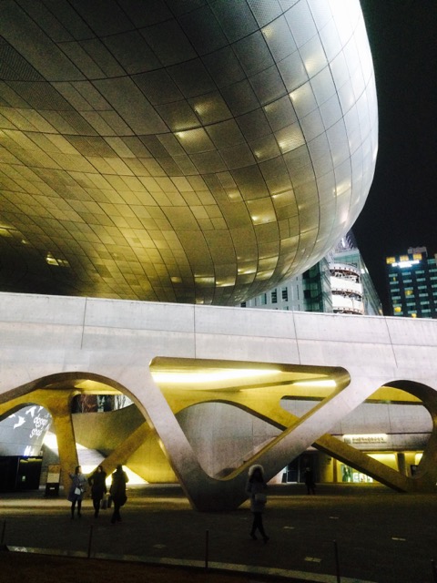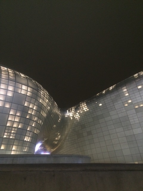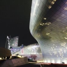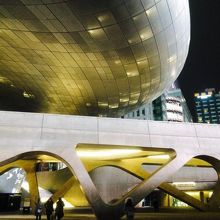 東大門歴史公園駅にあるデザインプラザ。とても近未来的な建物が目を引きます。ミュージアムなどの複合施設で随時特設展などが開催されていてARTIEな人はスケジュール要チェックです。見応えは昼より夜でしょう。イルミネーションというか、夜になると施設内のライトアップにより建物自体が宇宙船のように輝きます。まるで地球じゃないかのようなスケールです。ザハさん、世界的な建築家という肩書きは伊達ではないんですね。一見の価値ある建築です。