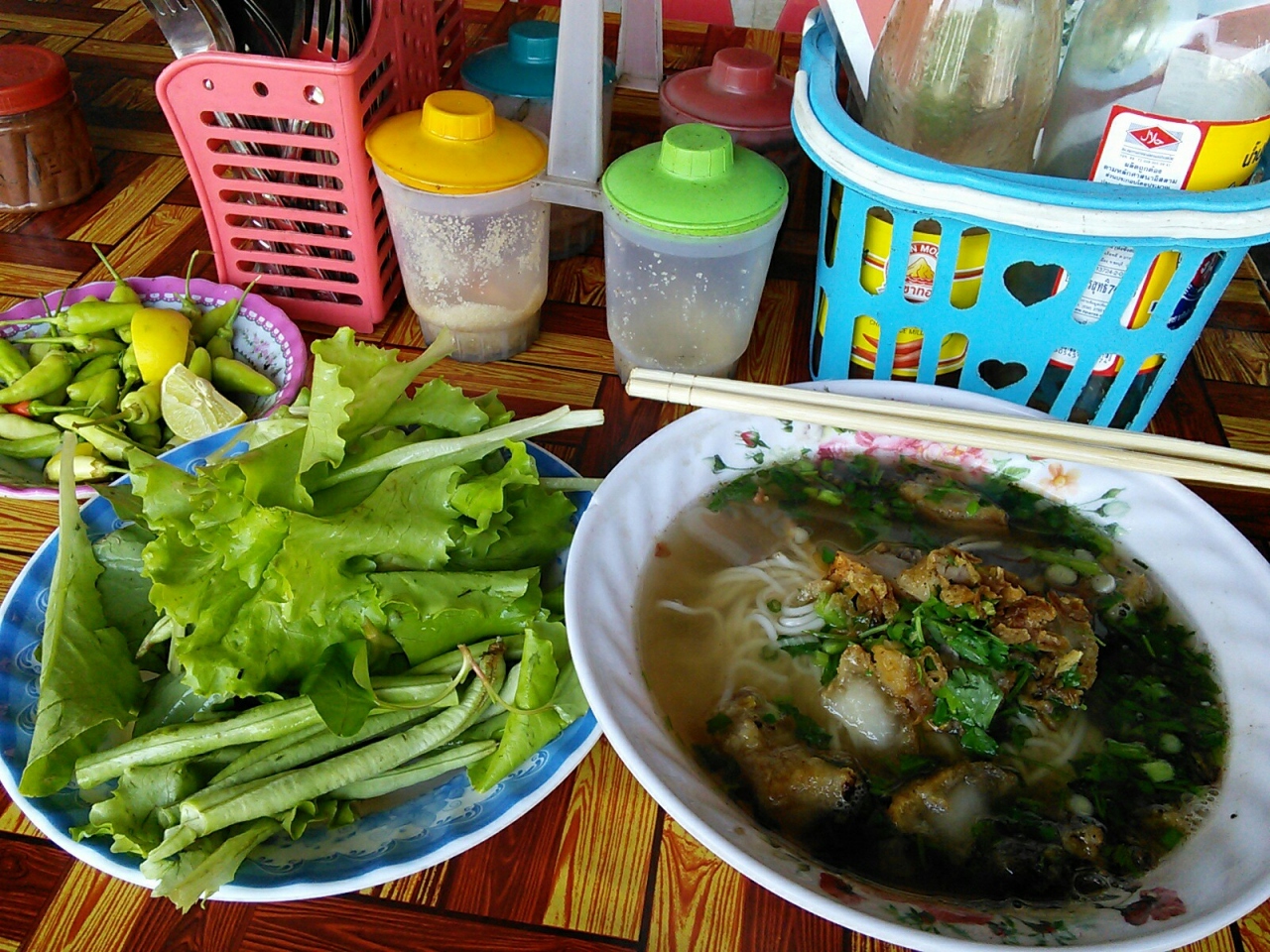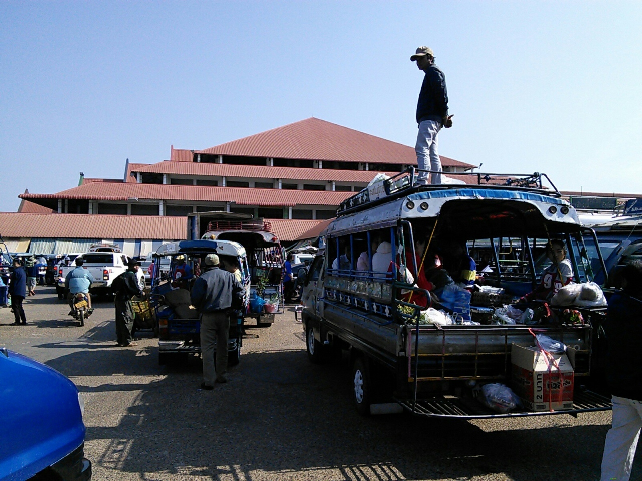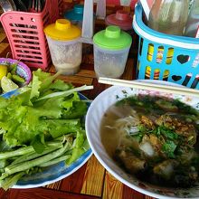 旅行者にとって見逃せないのが飲食コーナー。敷地内の北東側にあります。バットに何種類ものおかずが並んだいわゆる“ぶっかけご飯”なら15000kipから。カオクア(フライドライス)10000kip。麺料理フー10000kipなどが食べられます。カオピヤックセン(米粉うどん)を食べましたがボリューム満点、生野菜も別皿に盛り盛りの大サービス。味も抜群においしかったです。これで8000kip、さすが市場飯ならではです。バスターミナルからも徒歩2分と近いのでバスの待ち時間でも立ち寄ってみて下さい。