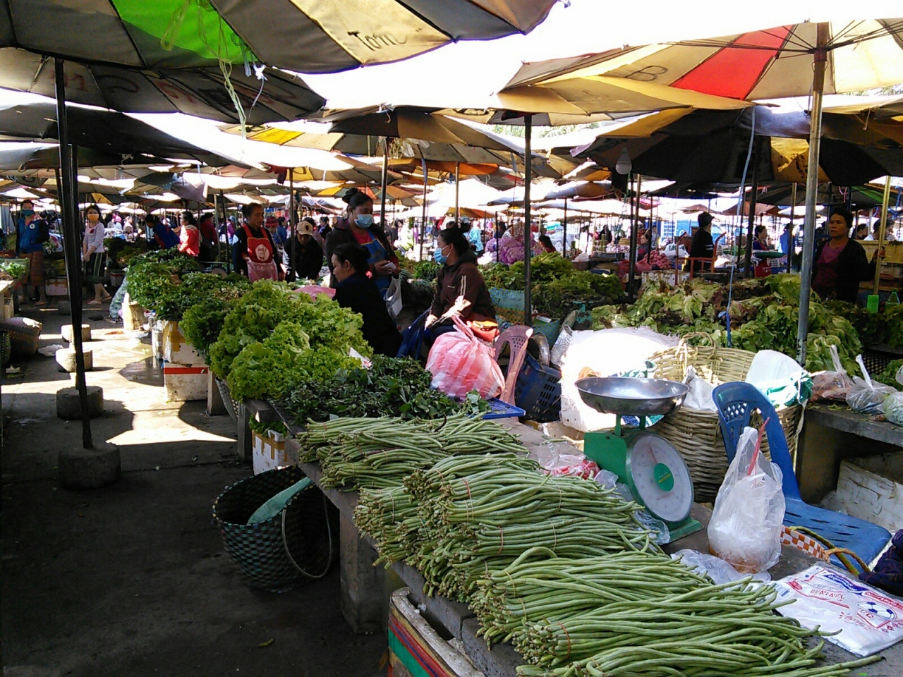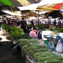 建物の西側に広がっているのがバラック建ての野菜、果物エリア。自分で栽培した野菜などをおばちゃん達が売っています。とにかく広く店もいっぱいでラオスのパワーが感じられます。朝方行くと活気に満ちています。