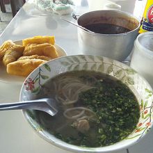 サワンナケートにもありました。5000kipでカオ ピヤック セン(米粉のうどん)が食べられます。しかも路上でおばちゃん1人がやっている屋台ではなくちゃんとイスとテーブルがあり調味料も揃っている店です。しっかりと肉も入っていてネギもどっさり、スープもいいダシが出ていてとってもおいしいです。通常のものに比べると若干量は少ないですが朝ごはんにはちょうどいい量です。物足りない人は皿に盛られて出される中国風の揚げパン(1個1000kip)で調節して下さい。6:00~12:00の毎日営業ですがなくなり次第終了なので早めに行ってみて下さい。