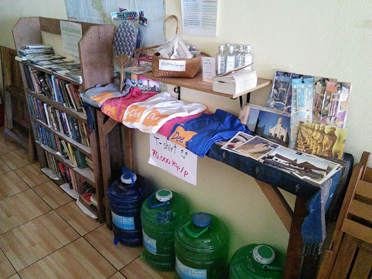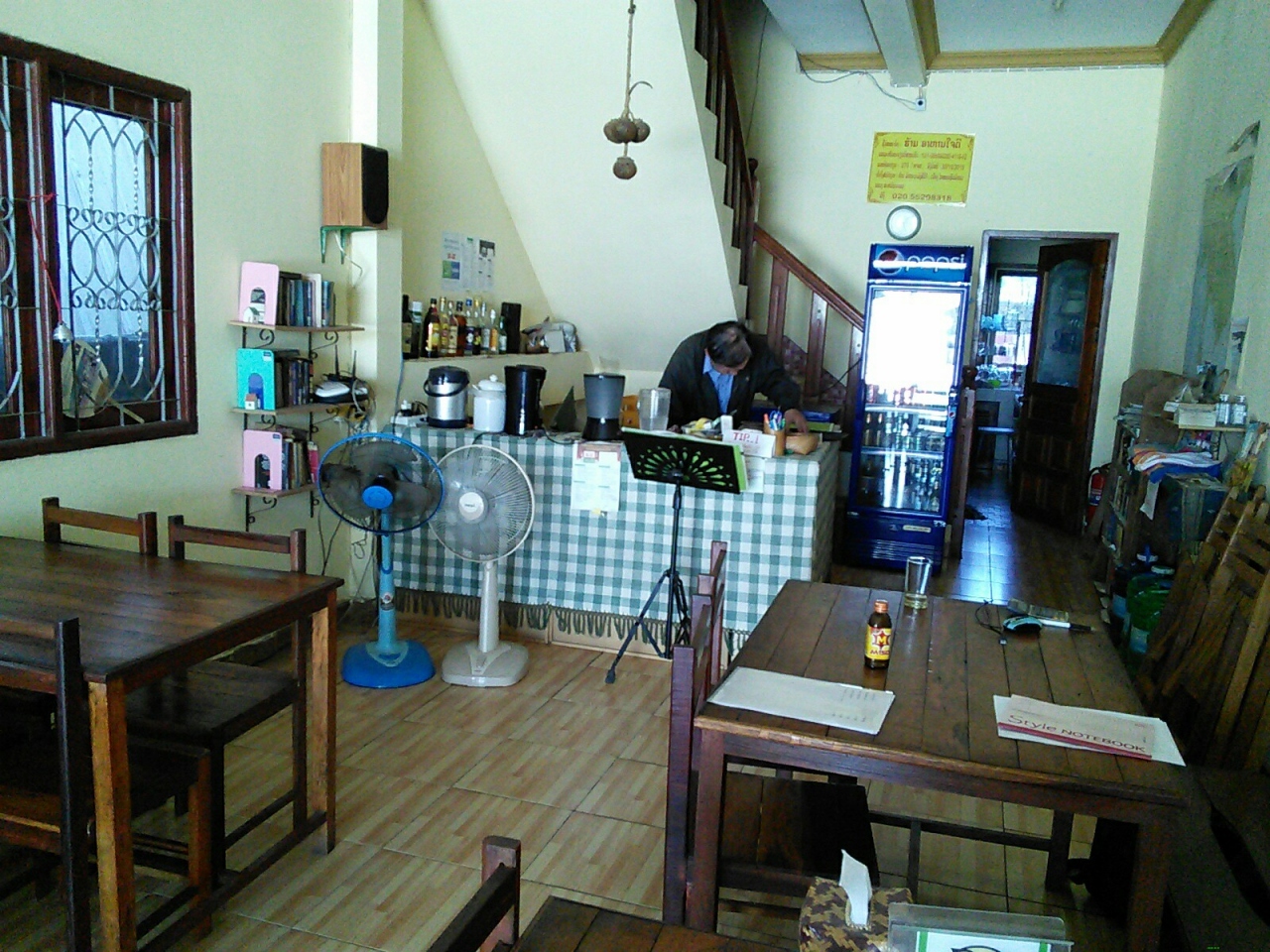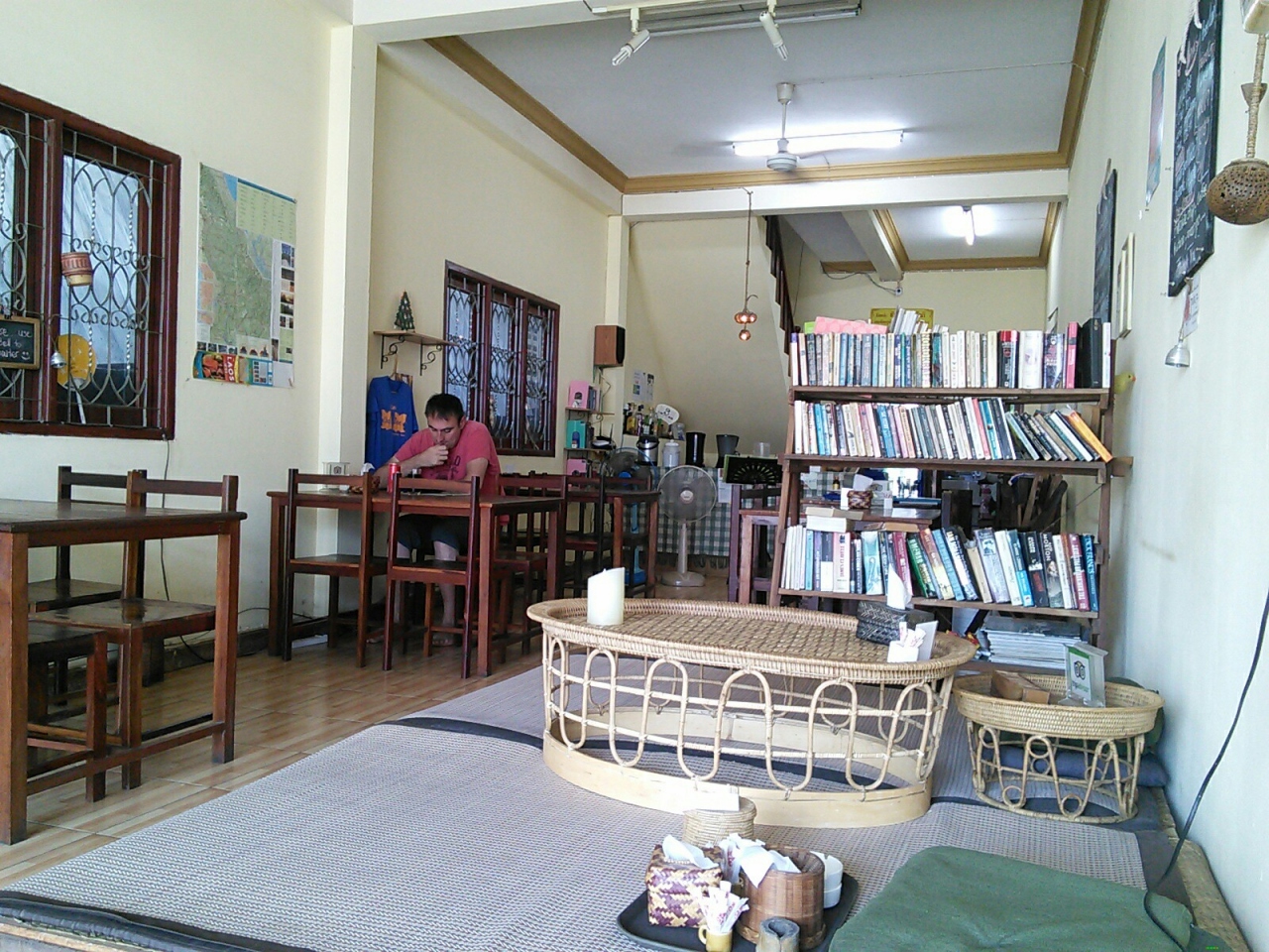 ネットをするために何回か使わせてもらました。昼時に行っても食事はできないと言われました。飲み物のみ。ラオコーヒー7000kip(アイスは10000kip)、コーラ(缶)、紅茶6000kipなど簡単なものしかありません。紅茶はリプトンのティーバッグがカップに入れられただけ。お湯もカップ六分目くらいしか入れてくれません。しかも砂糖もなし。言えばスティックシュガーを出してくれますがスプーンもわざわざ言わないともらえません。なんとも気の利かない店ですがそれも仕方ありません。店主は日本人なのですがかなり年配のおじいちゃんでよぼよぼでちょっと心配になる感じ。メニューを見るとカツ丼37000kipなどの日本食もありました。ディナーなら食べられるようです。WiFiは結構速く問題ありませんが停電の時は使えませんので先に確認した方がいいです。本が交換できますが日本語の文庫本はまったくありませんでした。