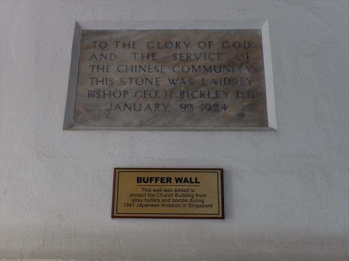 外壁の一部には、第二次世界大戦中の日本による占領時に流れ弾や砲撃から教会を守るために増設した壁という説明プレートも出ていました。