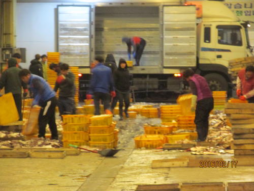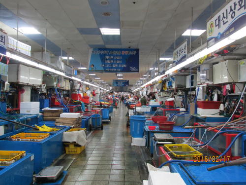 ツアーの夕食はチャガルチ市場を見学しながら市場内の食堂で頂きました。魚市場で海鮮鍋かと思ったら豚カルビでした。でも、韓国料理の小皿は沢山出て来たし、目の前の釜山港の夜景を見ながらの食事に満足、韓国ビールも飲みました。チャガルチというのは「石ころ、砂利」という意味だそうで、取れたばかりの魚を砂利の上に並べて売っていた事から付いた名前だそうです。この市場の起源は、朝鮮戦争の頃(1950年頃)にできた「チャガルチ魚介類処理場」と言われています。露店の市場から始まり、2006年には近代的な地下2階、地上7階のビルに建て替えられました。ビルは、屋根の形が釜山の鳥「カモメ」をモチーフとしてデザインされています。釜山港へかえれの歌にもカモメ「カルメギ」が出て来ます。次回は海鮮鍋を食べてマッコリが飲みたい。