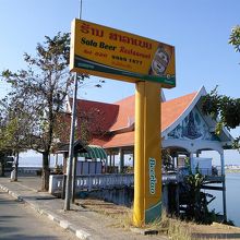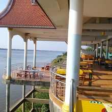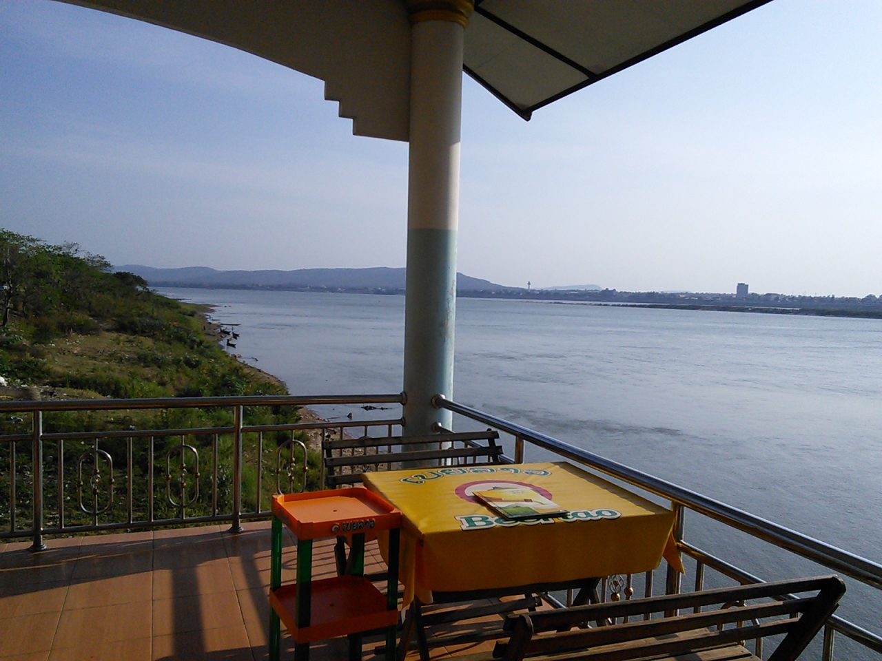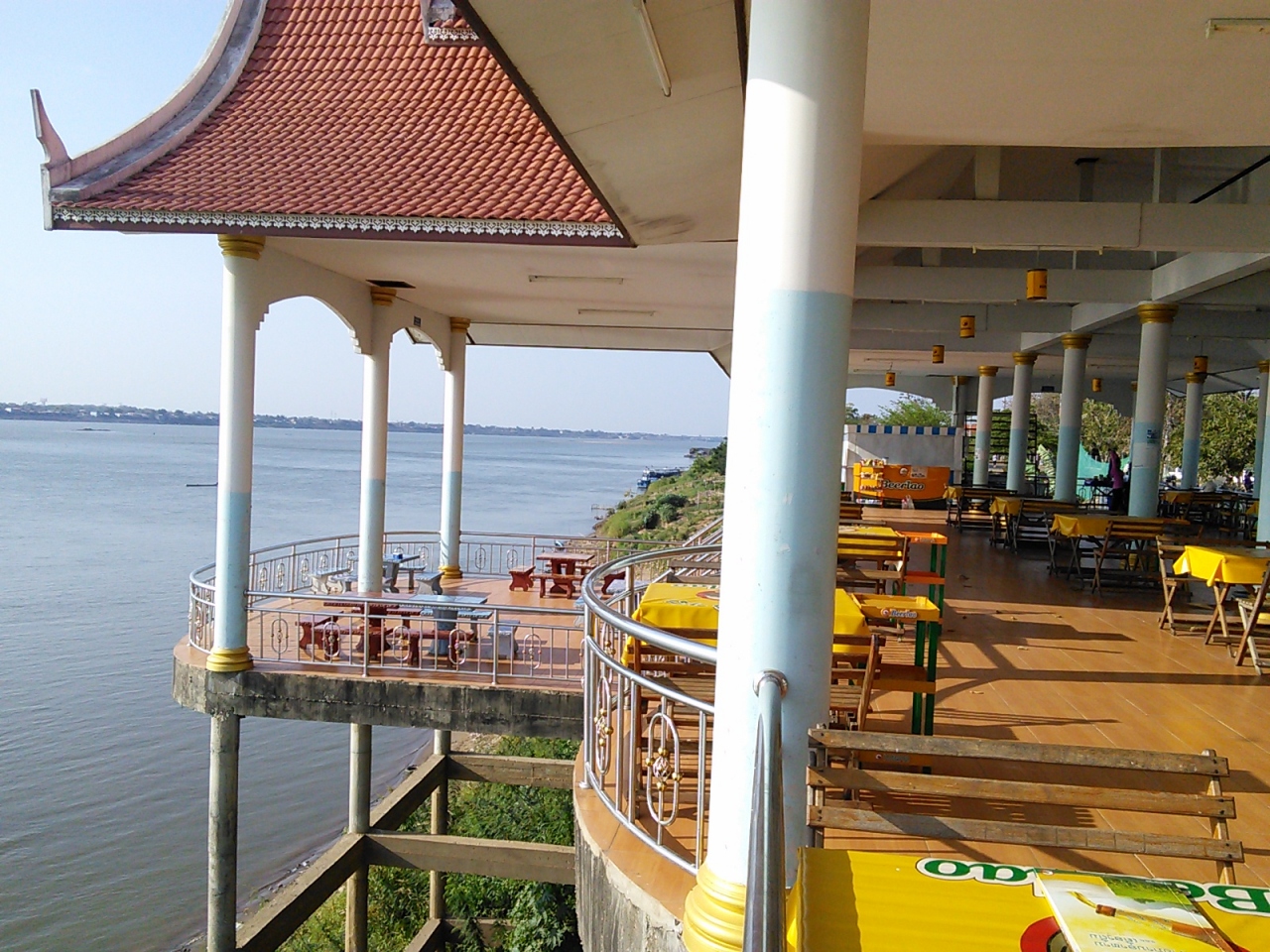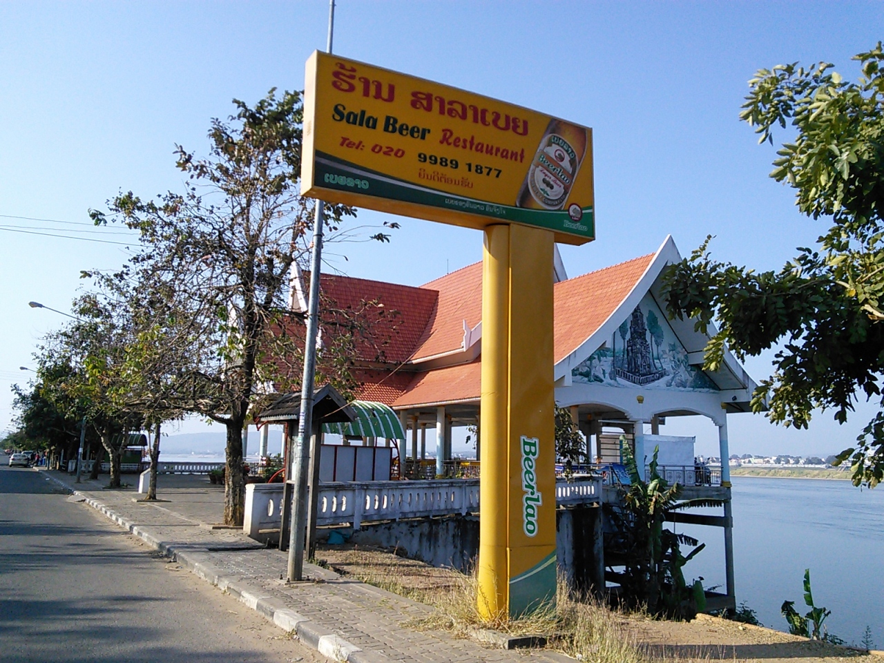 メコン川に突き出した大きな東屋を利用したレストラン。高級そうですがそれほど高くはありません。なんとビラアオ(大びん)は10000kipです。ツーリスト用のレストランやおしゃれなカフェより安く、その辺の屋台や商店と同じ値段です。しかもメコン川の雄大な眺めが付いているわけですからこれをお得と言わず何と言えるでしょう。空芯菜炒めやオムレツなど簡単なものなら15000kip、フライドライス、フライドヌードルなどは20000kip、その他25000kip~でいろいろなメニューがあります。ぜひメコン川越しに夕日が沈む時間に出かけて下さい。最高の眺めが待っています。