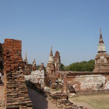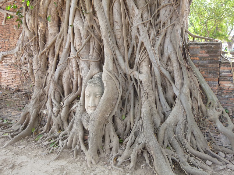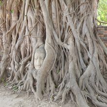 アユタヤの遺跡群の中でも見ごたえがあり、形状の異なる朽ちかけた仏塔がいくつも建ち、ここが嘗て都であった頃の繁栄を伺いしることが出来ます。この寺院のシンボルと言えば、なんといっても入り口から右手に進んだ所にある菩提樹の根元に浮かんだ仏さまのお顔でしょう。