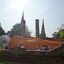 黄色の袈裟をかけられた白漆喰の涅槃仏が、ワット・ヤイ・チャイ・モンコンの寺院の一角にあります。それほど大きな訳でもないのですが、そばにある幾つかの瞑想する姿の仏像と相まって見ごたえがあります。レンガの低い壁などがあって全体像をカメラに収めるのは少々難しいですね。