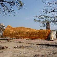 広大な草原のただ中に、長さ29mもある白い寝釈迦仏のみが寂しく横たわっています。自転車でアユタヤを回りましたが、途中はこれといった遺跡もなく、道を間違えたか不安にあることに漸く到着しました。また、他の遺跡は50元の参観料が必要なのですが、ここは無料です。