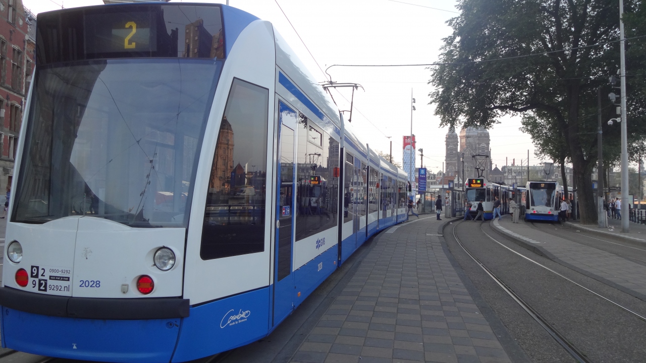 アムステルダム市内には、トラムが走っており、アムステルダム中央駅とダム広場を中心に放射線状に延びる路線と、環状路線があります。トラムの乗車券は、メトロ、バスと共通で、乗り放題の乗車券やOV-CHIPカードなどもあります。1時間券は€2.9、1日券は 24時間以内なら乗り放題で€7.5です。2日券、3日券などもあります。