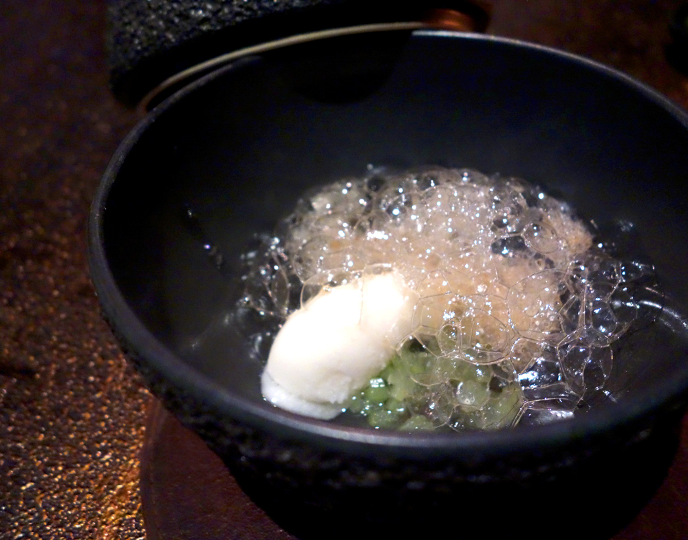 中身はソルベ。ジンジャーティーの泡も。下はキウイだったかな?この位置にソルベが来るってのが、何だか不思議。さっぱりして美味しいけれど。