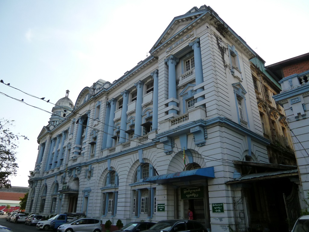 スーレーパゴダ通りをマハバンデューラ公園を左手に見ながらヤンゴン川に向かって進んでいくと、ミャンマー経済銀行第3支店の建物があります。白壁に淡いブルーの色合いが美しい歴史建築は旧インド帝国銀行の建物です。英国植民地時代に設立されたベンガル銀行は後にインド帝国銀行と合併します。この建物はそうした激動の時代、1914年に建てられました。外観のみの見学ですが、ロシアSt.ペテルブルクのエカテリーナ宮殿のような白壁と淡いブルーという色使いが上品で見応えがあります。