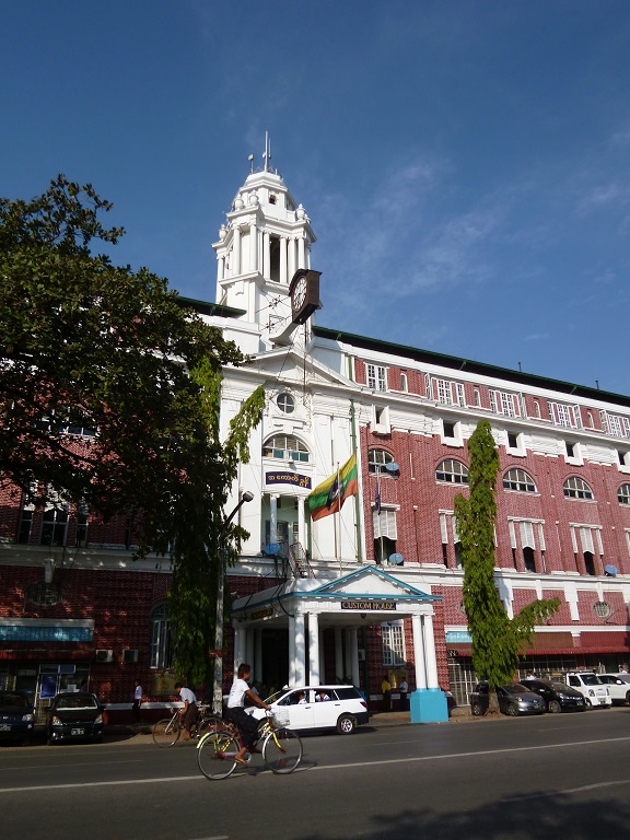 ヤンゴン川に面して立つ、レンガ色のエレガントな建物は通関業務を行う税関です。