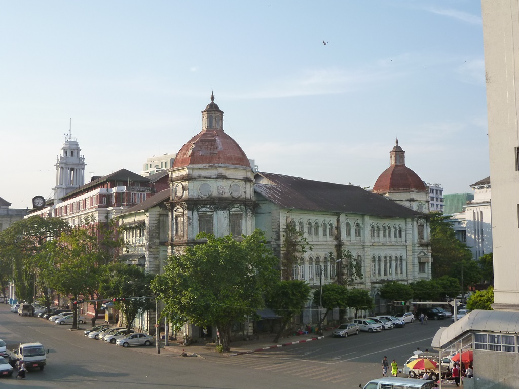 ヤンゴン川に面して立つ税関の東側、海運局の白亜の建物とはパンソダン通りを挟んで向かい合うように建っています。1900年頃に建てられ、太平洋戦争(大東亜戦争)の際には空襲の被害を受けるなど波乱万丈の一世紀を送ってきました。現在は裁判所の建物となっていますが、元は金融庁の建物でした。ドーム天井など美し構造をしていますが、全体的に相当老朽化が進んでおり、修復が待たれます。