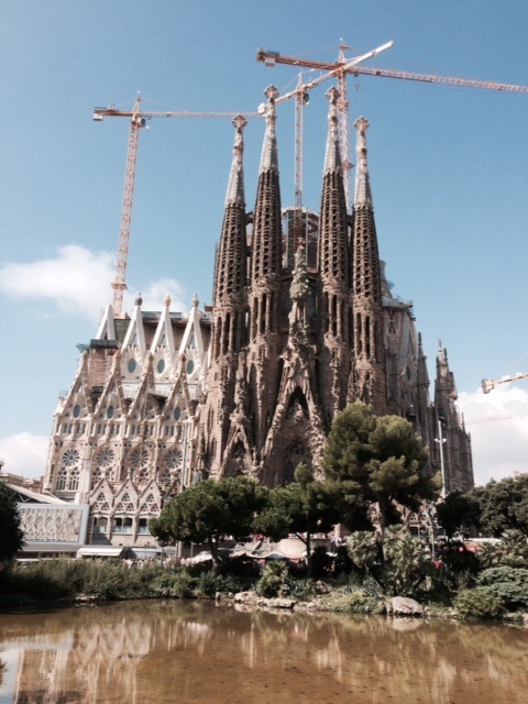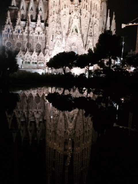 夜のライトアップも素晴らしいく、道路を挟んだ池から、サグラダファミリアが映り幻想的でした。