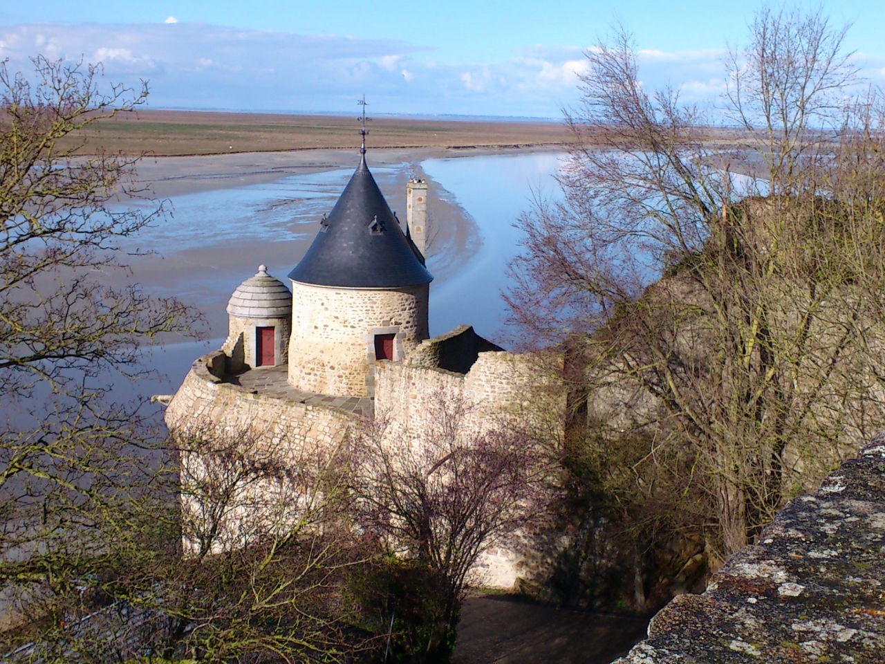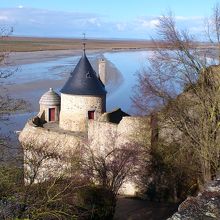 モンサンミッシェルの島の左側(西側)に城壁の一部となり海に突き出しているような形でとんがり屋根の丸い塔があります。モンサンミッシェルが要塞であった当時は見張り塔として使われた場所です。フランスはイギリスとの百年戦争していた時は、モンサンミッシェルは要塞だったのです。