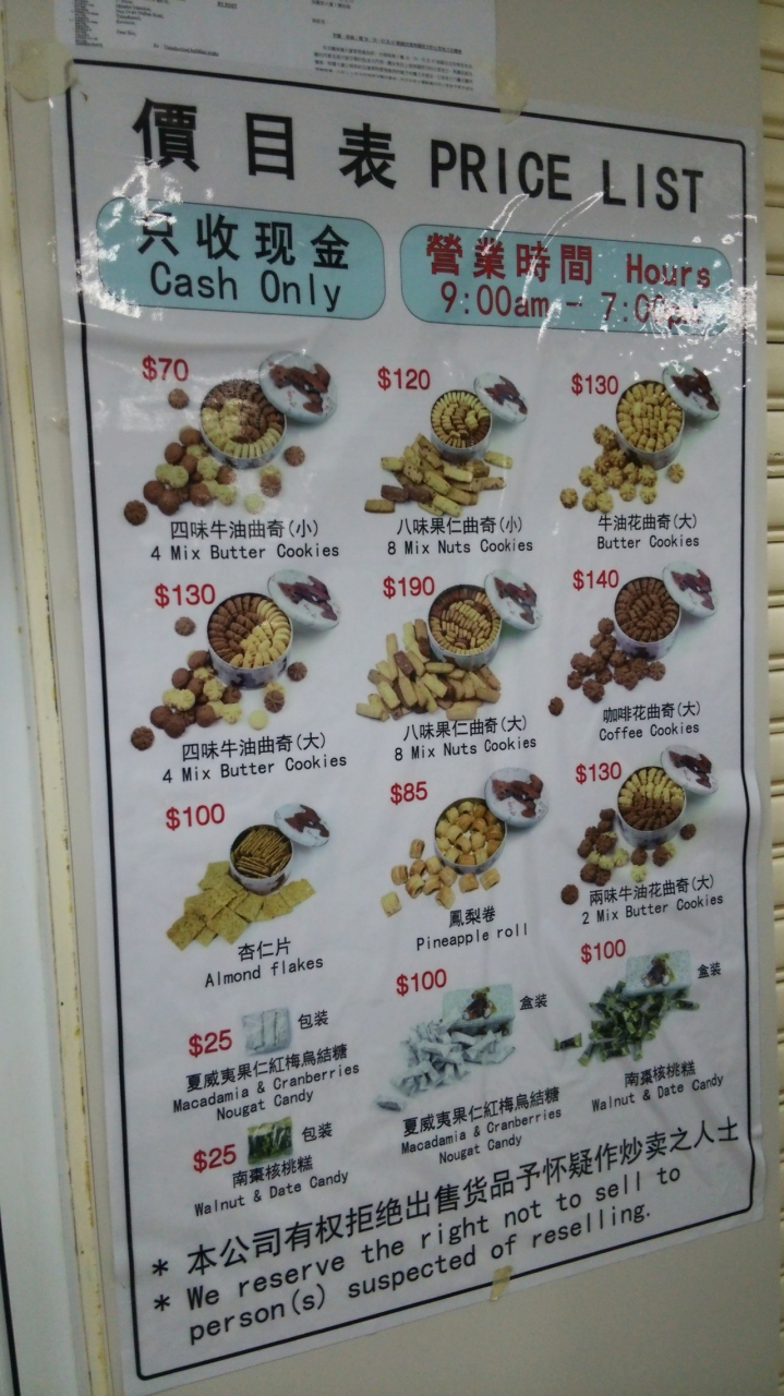 場所がちょっと解りづらい。チョンキンマンションの隣のホテルホリデイインのお隣の美麗都マンションの中、奥に進み二階に上がると人だかりがあるのですぐに分かる。人気店にも関わらず店構えはショボい。8種類のナッツ入りの小さい方を購入120ドル