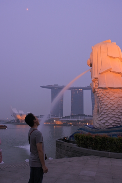 マーライオンが海ごしに見つめるのは、マリーナベイ・サンズ。SMAPが携帯電話CMで歩いていた船を模した巨大ホテル。絶好の写真撮影スポットです。