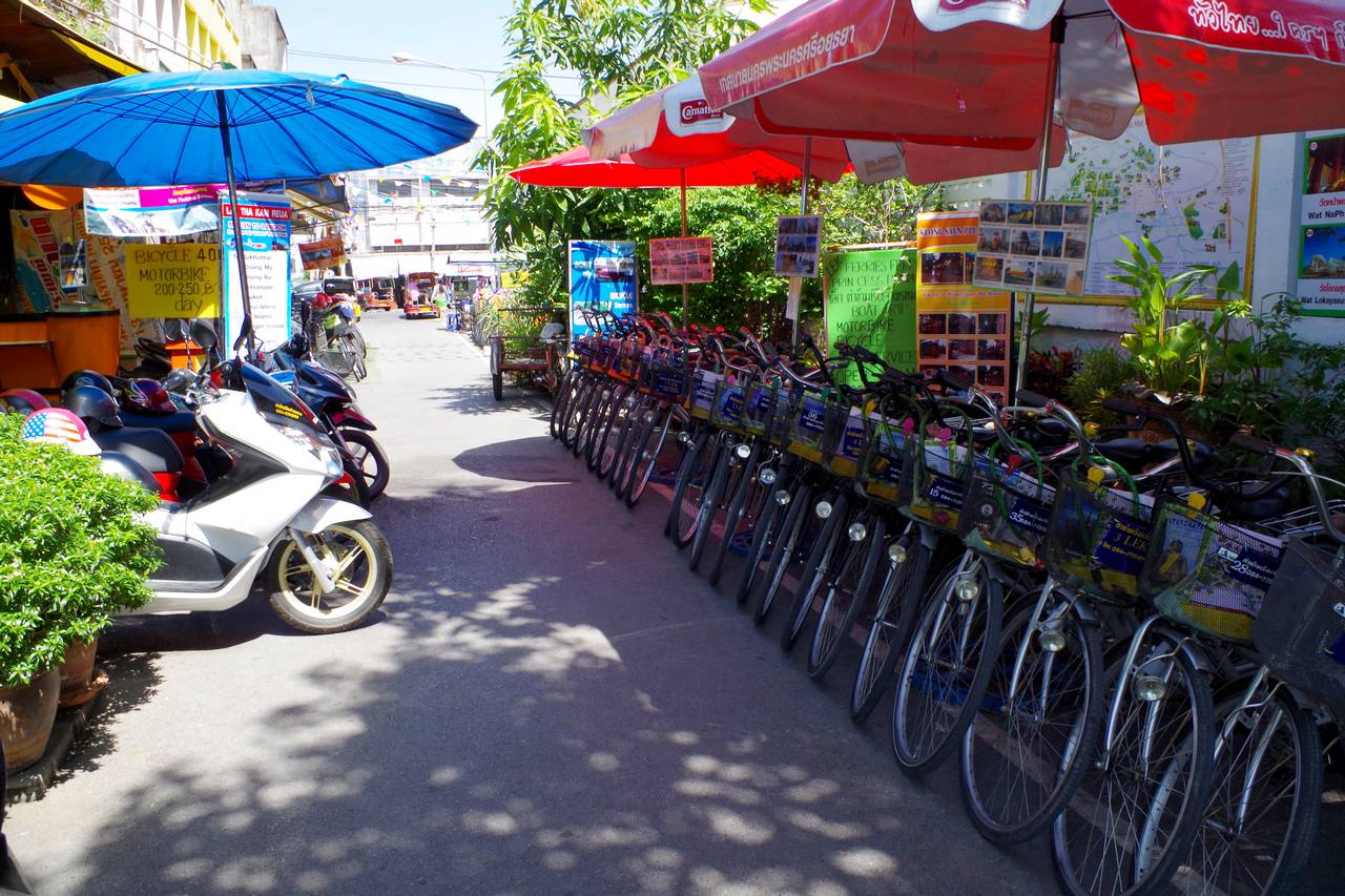 アユタヤの見所は川に挟まれた4km×3.5kmほどのエリアに固まっていて、そのエリア内なら小回りの利く自転車が圧倒的に便利だと思う。バスターミナル近くのゲストハウスにレンタサイクルのサービスがあり、1日借りても40B。もしワット・ヤイ・チャイモンコンなどの川の外のエリアに行こうと思うなら結構離れているし、車道も通るのでトゥクトゥクの方が良いかもしれません(自転車でももちろん行けますが