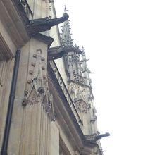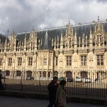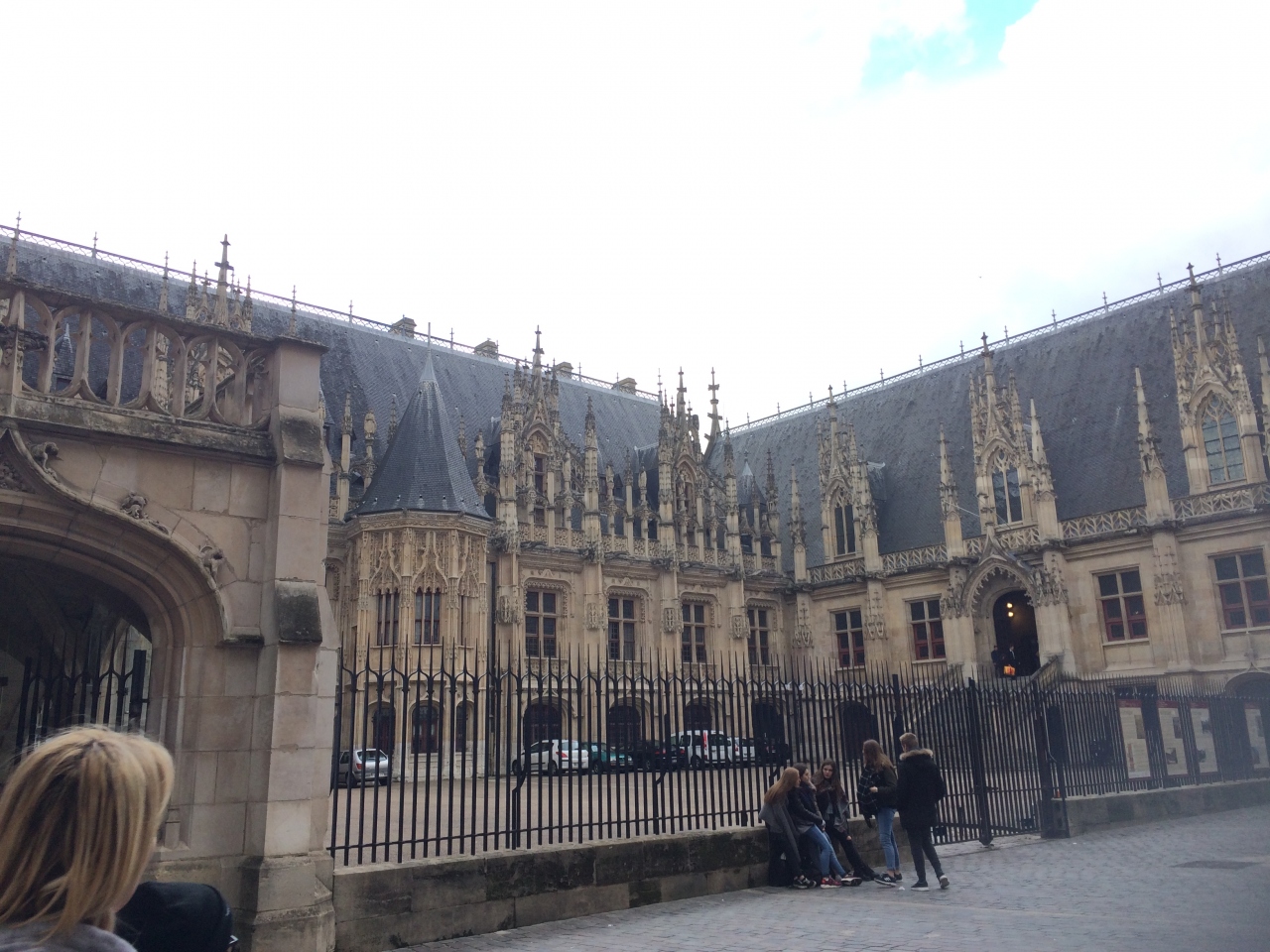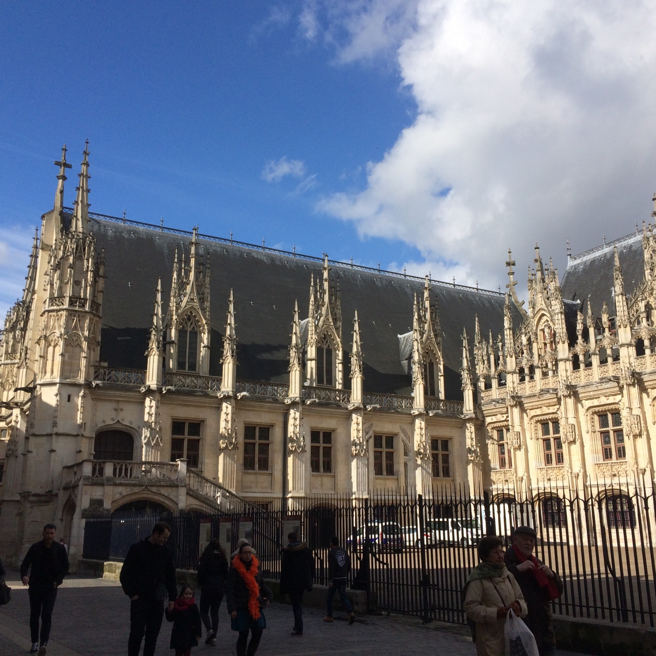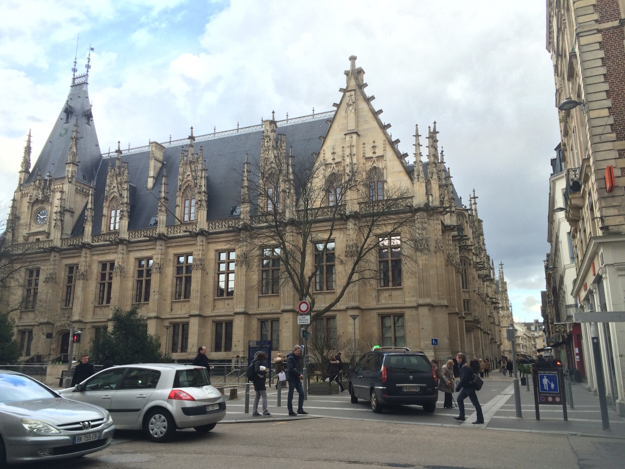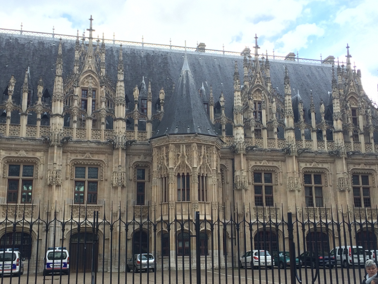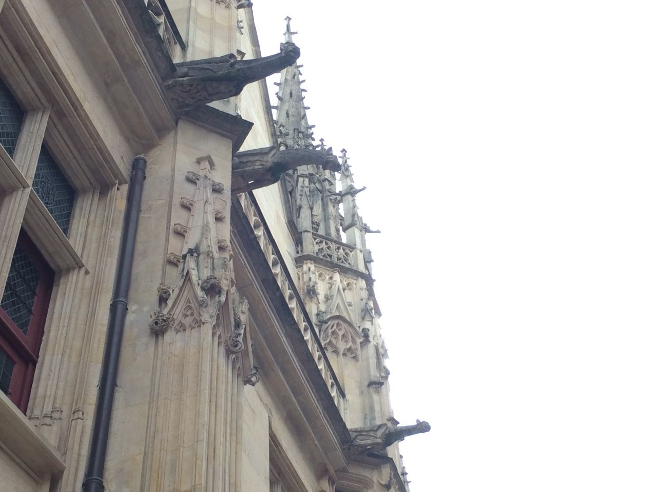 教会のような威風堂々たる、この建物は旧ノルマンディー地方議会で、現在は裁判所として機能する建物です。1499年に着工された、この建物のファサードの素晴らしい装飾は一見の価値があります。また、この建物で特に注目すべきは怪物などをかたどった雨樋の機能をもつ彫刻群です。ガーゴイルはフランス語ですが、元々は「喉」を意味するラテン語から派生したもので、動詞形は「ガラガラとうがいをする」するという意味で、怪獣の口の部分から水が流れ出るイメージとぴったりです。建物の外壁に残る弾痕にも注目してみて下さい。これらの傷跡はノルマンディー上陸作戦の時のモノと思われます。ノルマンディー上陸作戦は第2次世界大戦中の1944年6月6日に行われた、アメリカ軍を主体(アメリカ軍21個師団&イギリス軍、カナダ軍、自由ヨーロッパ軍26個師団)とする連合軍が、ナチス・ドイツに占領されていたフランス北西部を奪回するため、ドーバー海峡を渡ってノルマンディーの海岸から上陸した人類史上最大の作戦として語り継がれています。艦艇5300隻,航空機1万4000機,兵員17万6000人が投入され、最終的に300万人近い兵員によって展開されたこの戦いは、連合軍側の勝利に終わったものの、ドイツ軍の必死の抵抗により2ヶ月以上も要し、ノルマンディー各地に深い傷跡を残しました。
