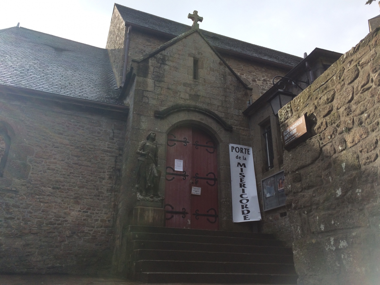 モン・サン・ミッシェルは修道院を中心とした島ですが、かつては700人ほどの村人が、この島に暮らしていました。現在は、この島に暮らす人は、宗教関係者を除くと数人のみです。修道院への参道であるグラン・リュ通りの坂の途中にあるサン・ピエール教会は、かつての村人のための教会です。大天使ミカエルを祀る教会で、正面ファザードに立っているのは大天使ミカエルのお告げを聞いて、百年戦争を勝利に導いたジャンヌ・ダルクの像です。教会の裏にはモン・サン・ミッシェル名物のオムレツで有名なプラールおばさんをはじめとするプラール家のお墓もあります。