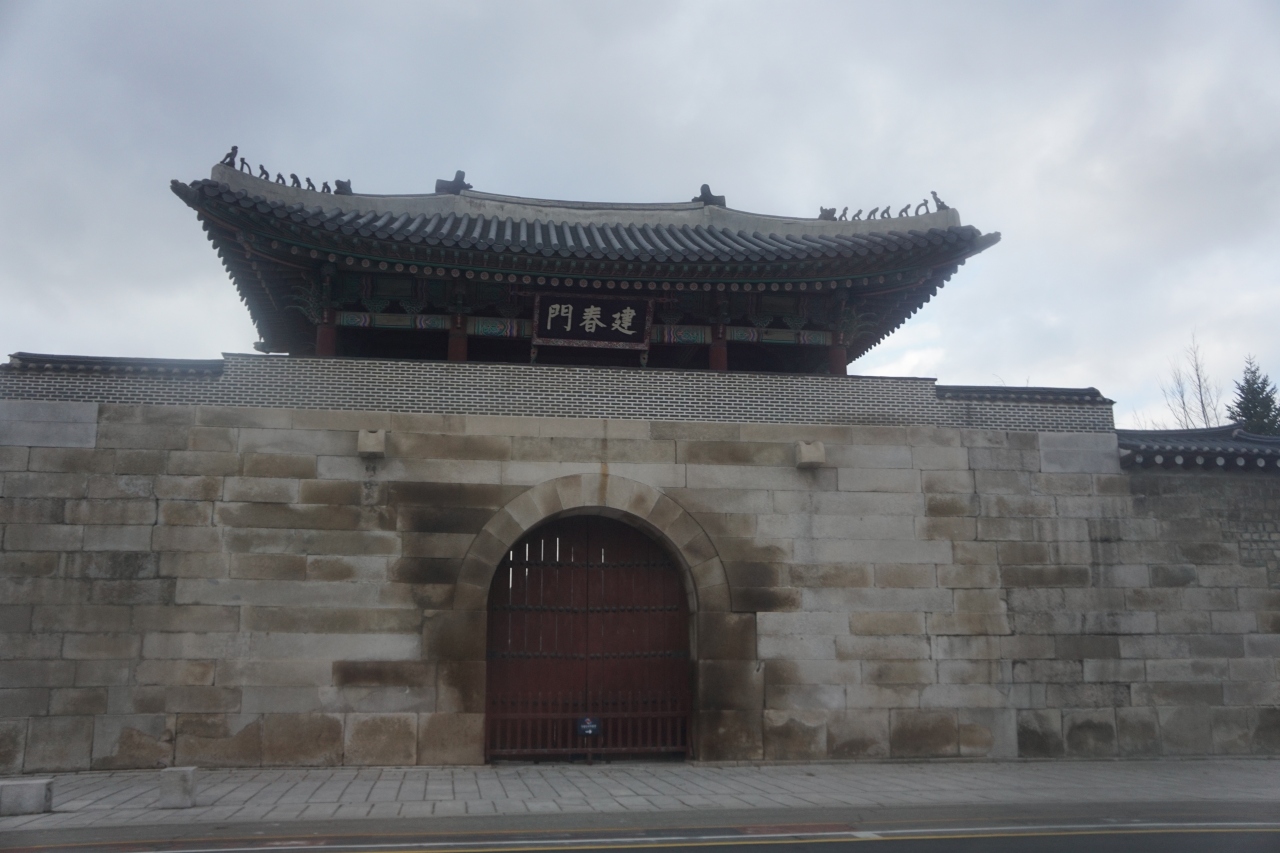 建春門は、景福宮の東側。三清洞の方角に向かっていますが、普段は閉まったままのようですね。屋根には三蔵法師の飾り。入口は一つだけなので、身分の違いに応じて、通る場所が違うといったことはできない門。ガッチリしていて防御は完璧でしょうが、やっぱり裏門というような位置づけなのかなあと思います。