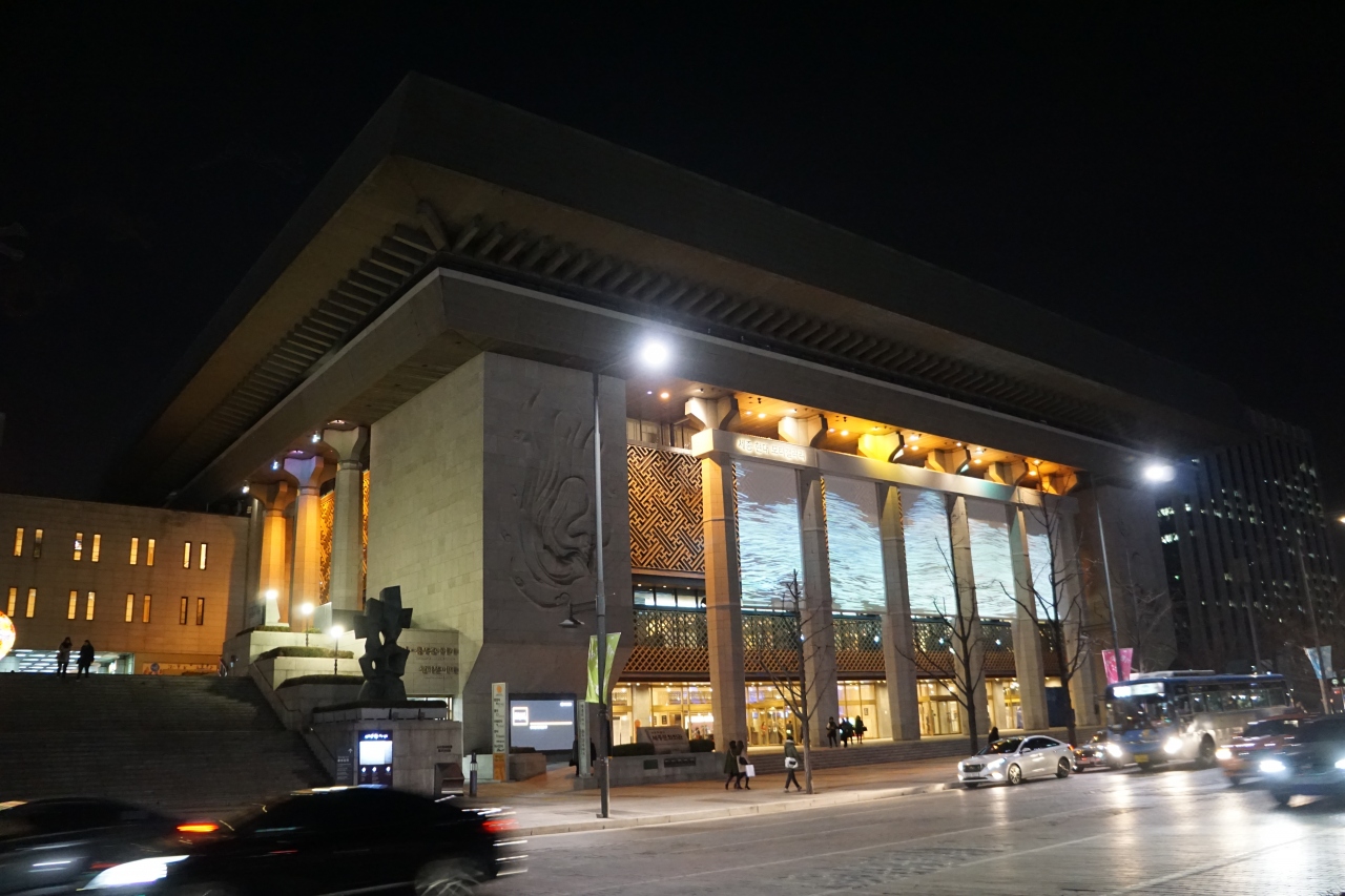 世宗文化会館は、光化門広場の脇に建つ巨大なコンサートホール。光化門広場を挟んだ向かい側はアメリカ大使館があって、ソウルではこの辺りが一等地なんだそうです。夜のライトアップがとても雰囲気があって、撮影ポイントとしては最高だと思います。