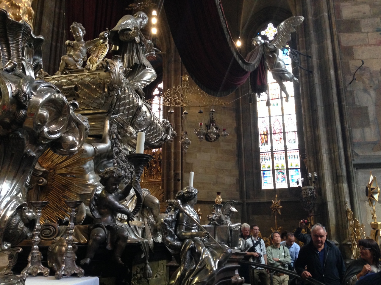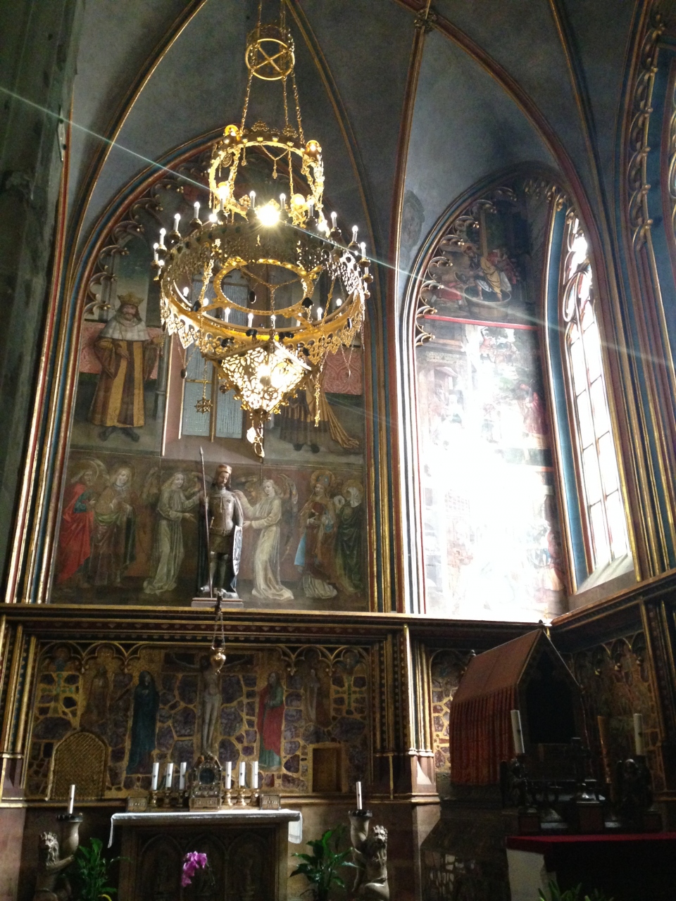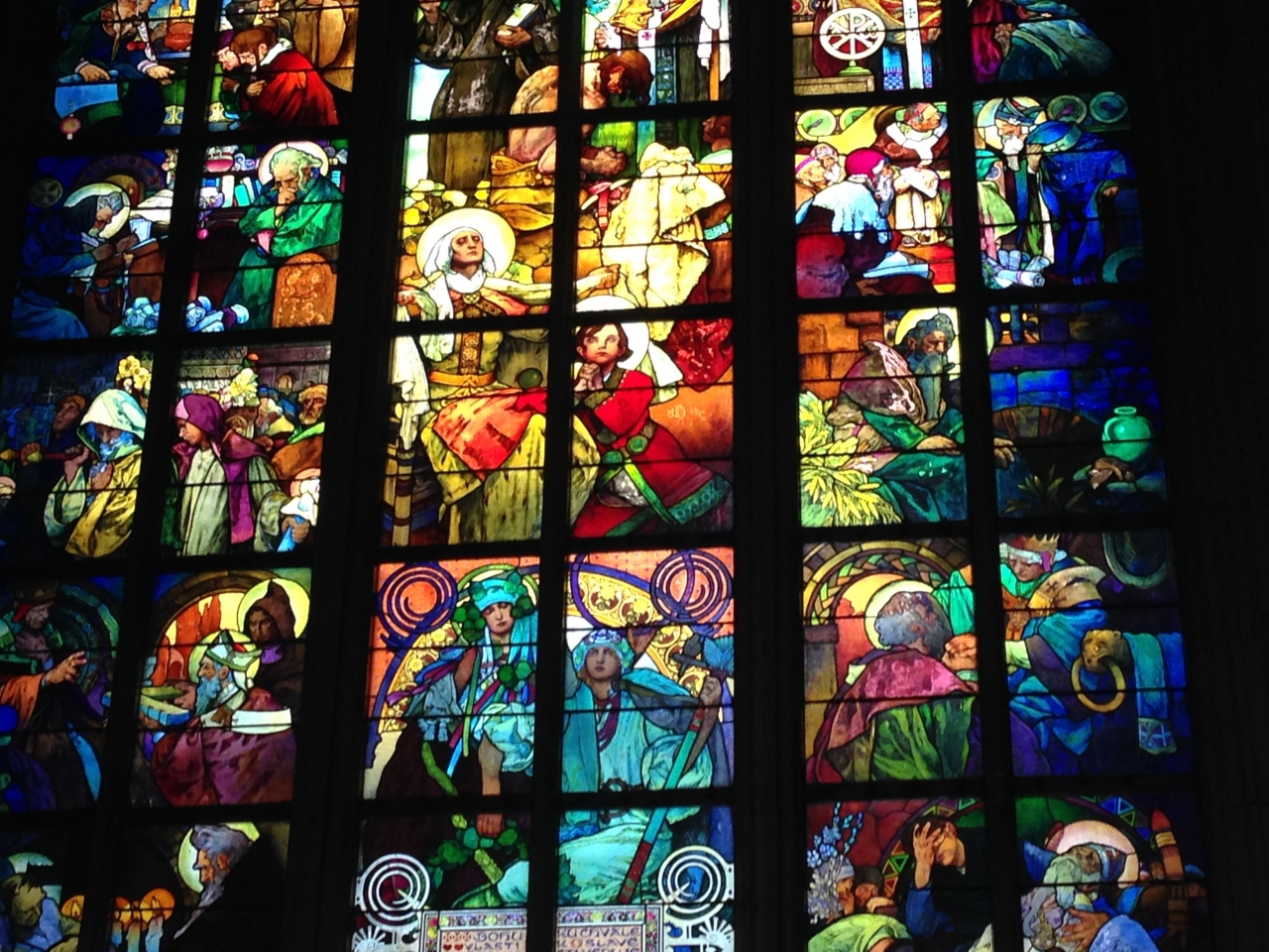 これのためにプラハに来ました。ミュシャの絵は他でも見れますがステンドグラスは珍しいです。教会自体も好きなのでこの組み合わせは本当に感動です。到着時はミサの最中だったようで音は漏れ聞こえるものの入り口は閉ざされていました。敷地内のほかを見て戻った(恐らく12:45とか)時、列が出来始めたので慌てて並び、すぐに長蛇の列に。丁度日陰になる方に列が伸びるので、少し肌寒いです。寒い時期だと防寒した方が良いです。15分も待たずに開場、一気に入るので混むかと思いきや、建物自体が非常に大きく、ステンドグラスも大きく上方にあるし、一方通行で順路が決まっているのでそれほど混雑した感じを受けずに見て写真も撮れます。列も割りと一気に進んでいたんじゃないでしょうか。目当てのミュシャは勿論、他のステンドグラスも一つ一つ個性があって興味深いです。ミュシャのステンドグラスは順路の初め、入ってすぐ左手にあり、一周回って戻ってからも再度良く見れます。バラ窓や他の絵も、事前によく知らなかった展示物も興味深かったです。