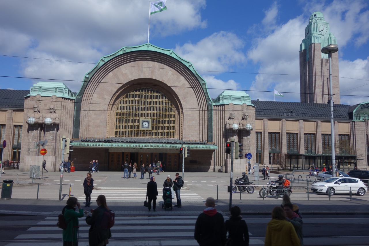 日本では東京駅にあたる,ヘルシンキ中央駅です.フィンランド各地へ向かう列車が発着していますが,それよりももっとのんびりした感じでした.駅舎は花崗岩製だそうで,入口のわきには像が左右2体ずつ4体もあり,なかなか重厚な感じです.