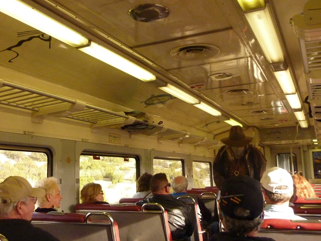 また、行きにはヴァイオリン奏者が楽しい音楽で場を盛り上げ、帰りには馬に乗った盗賊たちが乗り込んでくる劇をやってくれました。スタッフから「身の危険を避けるために少額のお金を渡しましょう!」と言われ、乗客はみな、ベルトや袖、帽子のつばに1ドル札を挟んで、それを取らせていました。