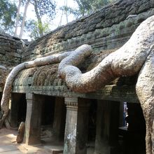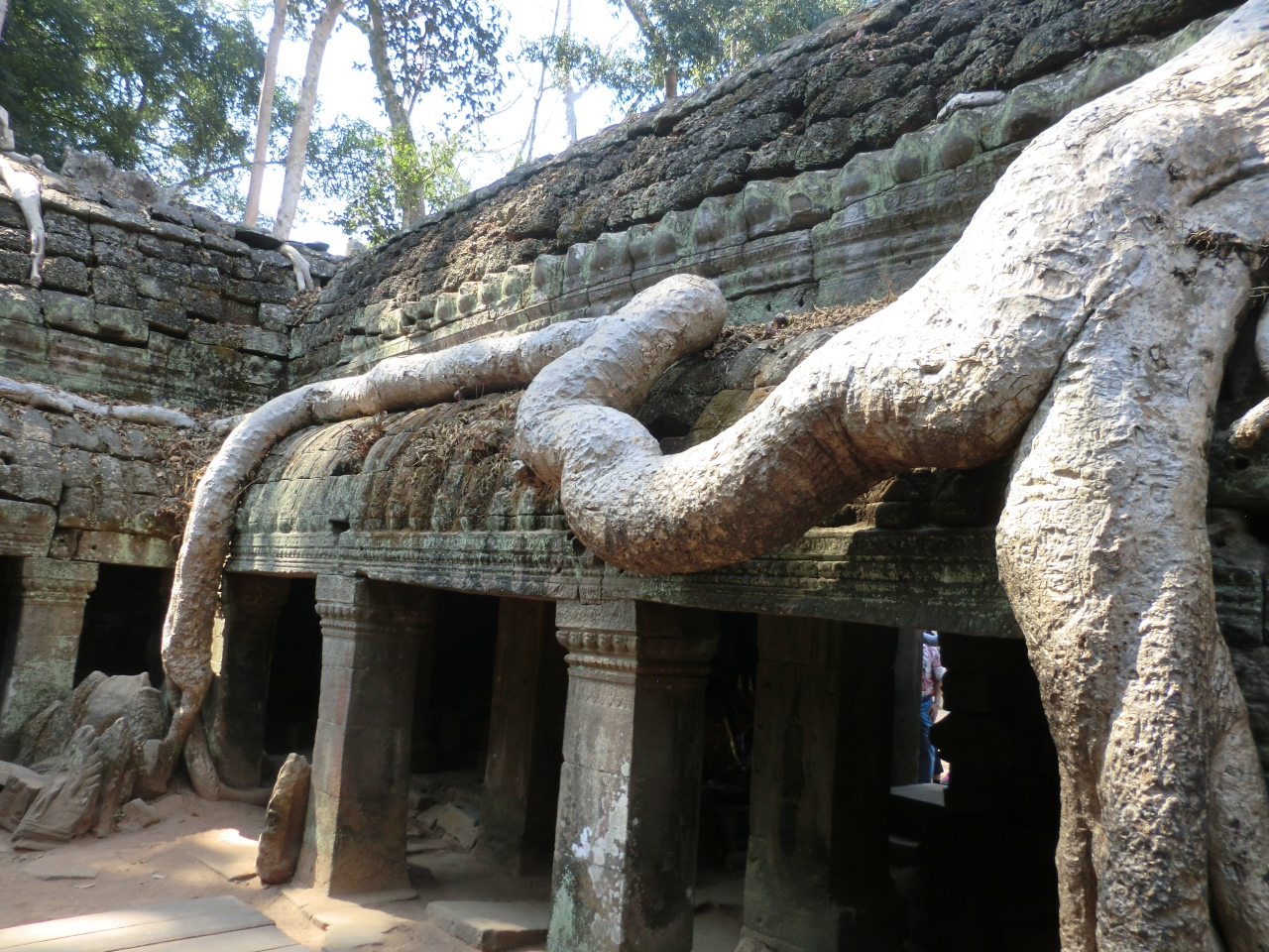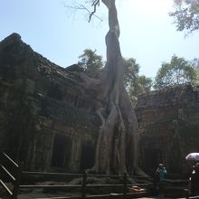 白い木肌が美しいガジュマルの一種の大木に壊されそうなのか、守られているのか、不思議なバランス。縦横無尽に木の根が張っていて、まるで生きているかのようでした(木も生きているのでが……)。