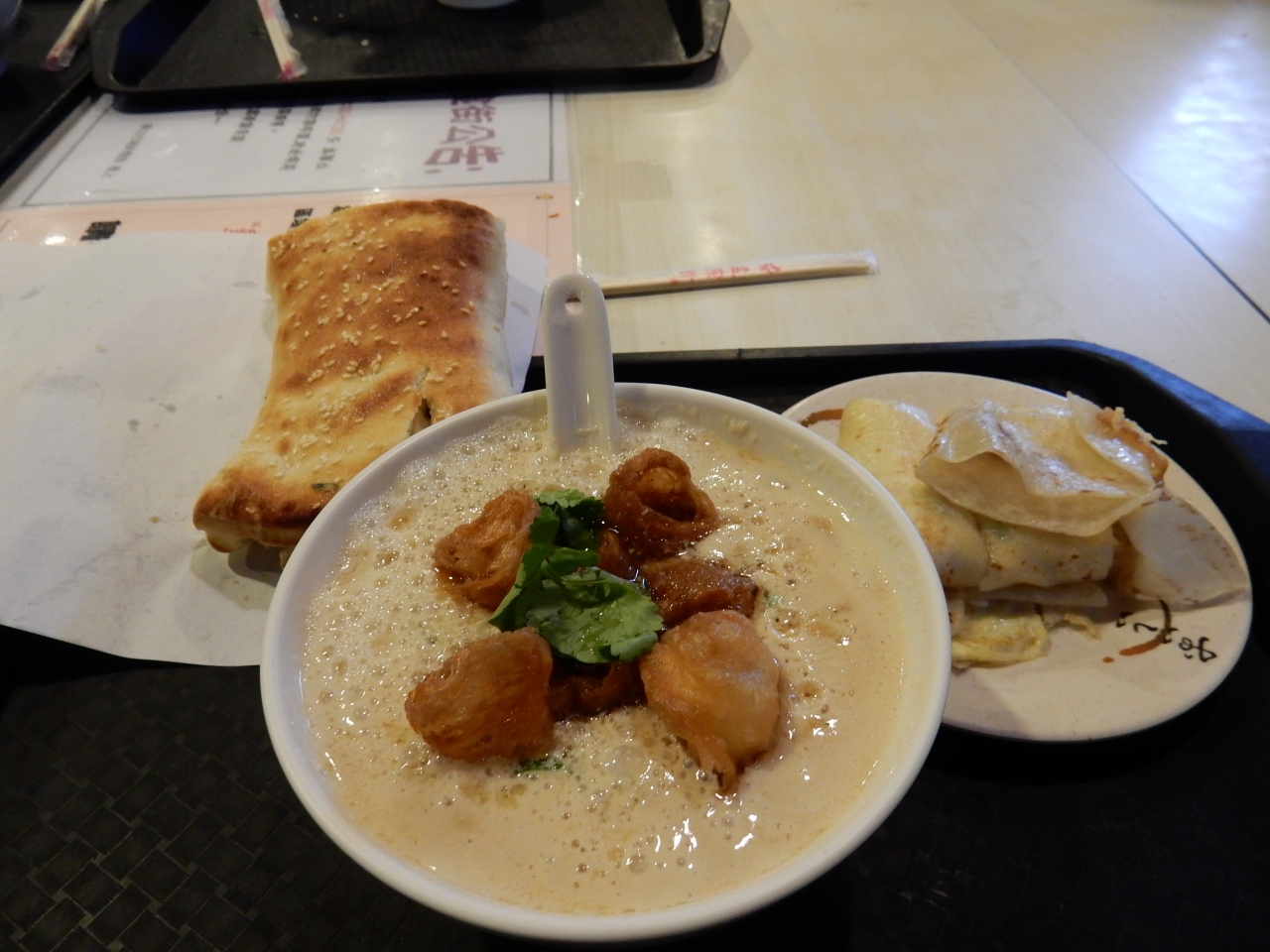 塩味の豆乳は日本のそれとは全く異なりましたが、揚げパンなどを浮かせて、美味しく