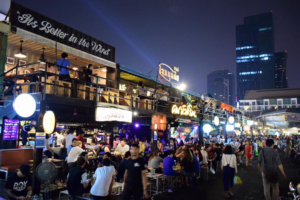 MRTタイカルチャーセンター駅とリンクしている駅ビル、エスプラネードの裏手に広がる最新のナイトエンタメスポット、タラート・ロットファイ(鉄道市場)。現在、タイの若者の間で最も話題のスポットであり、週末には多くの地元民、観光客で賑わいを見せています。