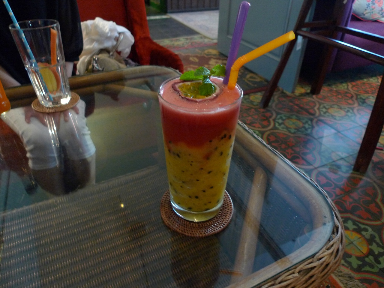 ジューサーの音がしていた割にが遅いなと思っていたら、ものすごく手が込んでものだった。スムージーというより、もう料理みたいなもの。見た目は派手だが、味はオーソドックス。