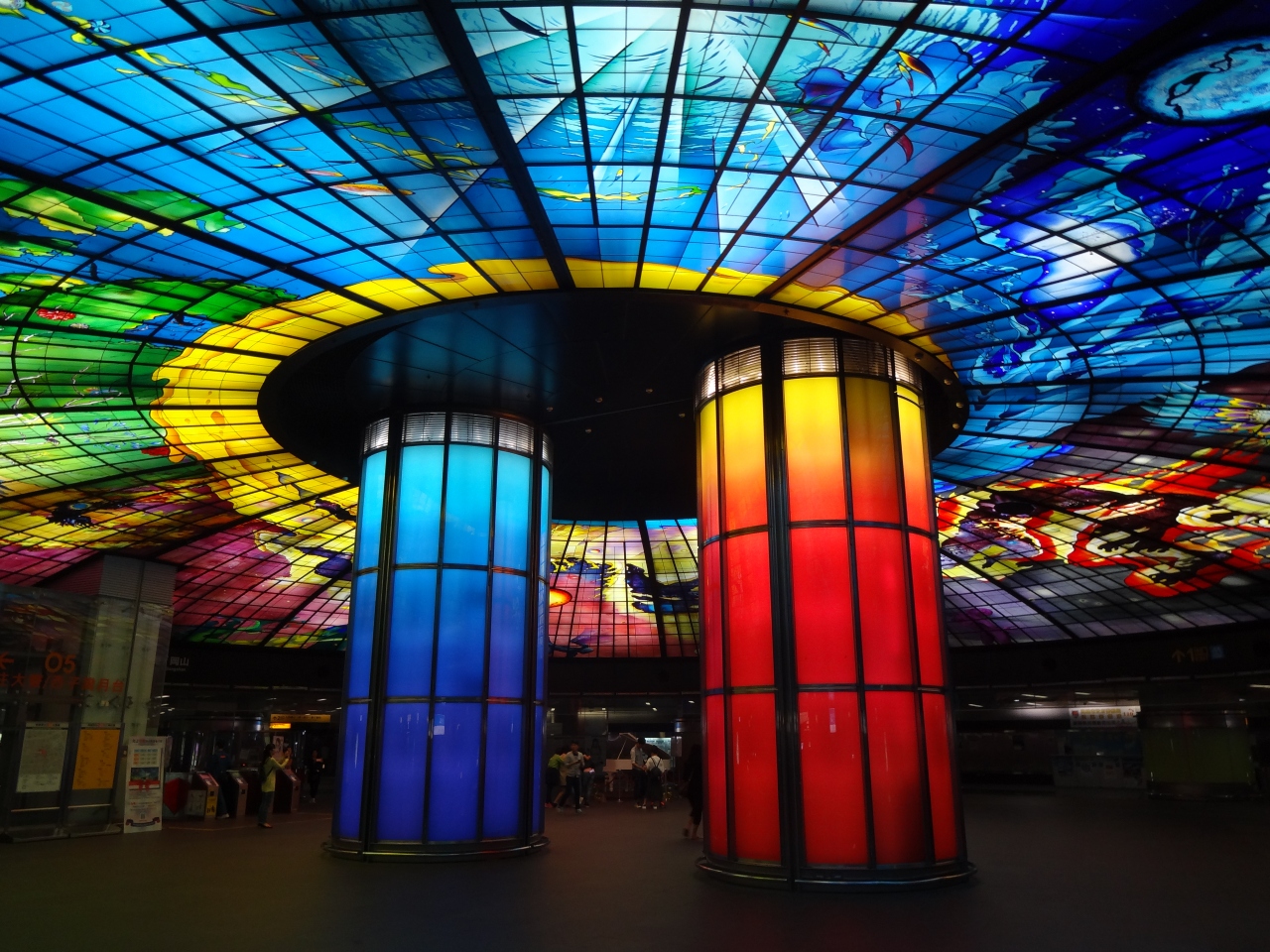 高雄の地下鉄の2線の交差駅であり、乗換駅でもあります。また有名な夜市の最寄り駅でもあります。切符を買うフロアに綺麗なオブジェがあり、この駅の名物のようです。よく通る駅だと思うので、これを見にくるのもいいかもしれません。