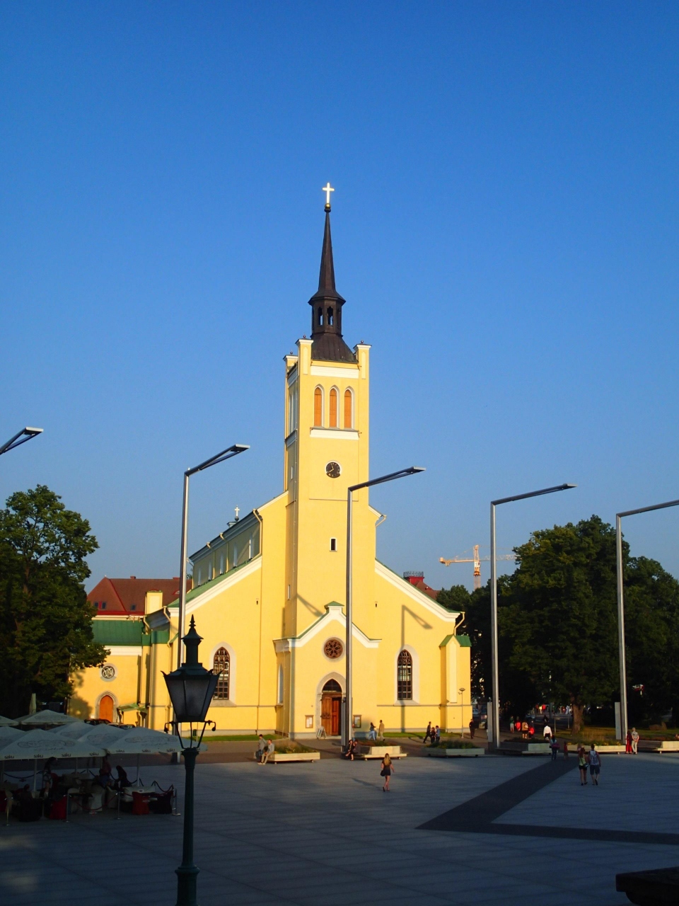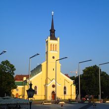 塔を持つ黄色い教会で、わりと殺風景な広場においてアクセントを与えています。