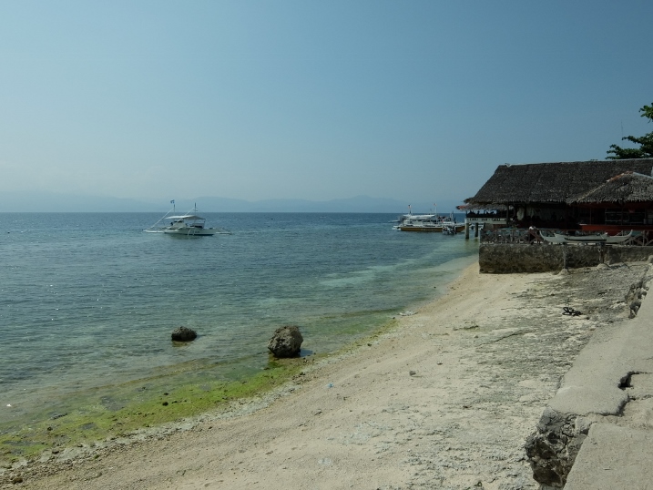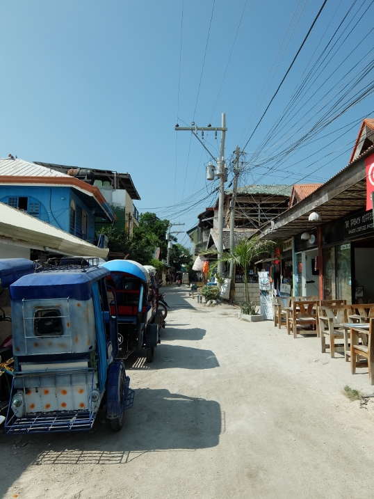 ダイビングのため訪問。空き時間に海沿いの道を歩いてみました。小さい町ですがやはり観光客が多いためか、規模の割にはレストランが多かったような気がします。しかしレストランとダイビングショップ以外、ほとんど何もありません。マッサージ屋も1~2軒見かけましたが、屋外かドアのない屋内という感じ。エアコンの効いた部屋で施術を受けたいならホテルのスパへ行くのが正解です。トライシクルはあちこちで待機しているので、移動には困らないでしょう。ダイビングが終わる時間を狙って、フルーツを売るおばさんがショップの前で待ち構えていました。