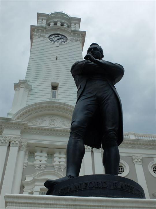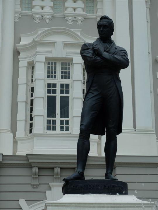 ただし、その像はオリジナルからのコピーで、ラッフルズ卿上陸150年を記念して建てたもの。