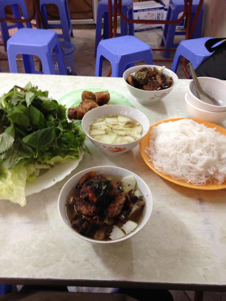 日本でガイドブックを見て絶対に行ってみたいと思い足を運びました。お昼に行ったら人が1階は人がいっぱいで二階に案内されました。すでにテーブルには野菜と麺がおいてあり、後からおつゆが来ました。おつゆにはお肉とミートボールを潰したようなひき肉のかたまりがゴロゴロと沢山入っていて、つゆの味は少し酸味がありとても美味しかったです。ブンチャーまた食べたいです。