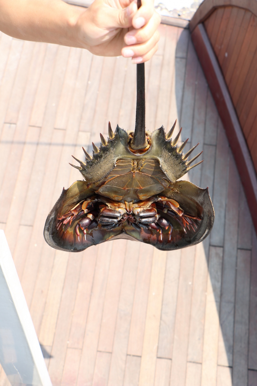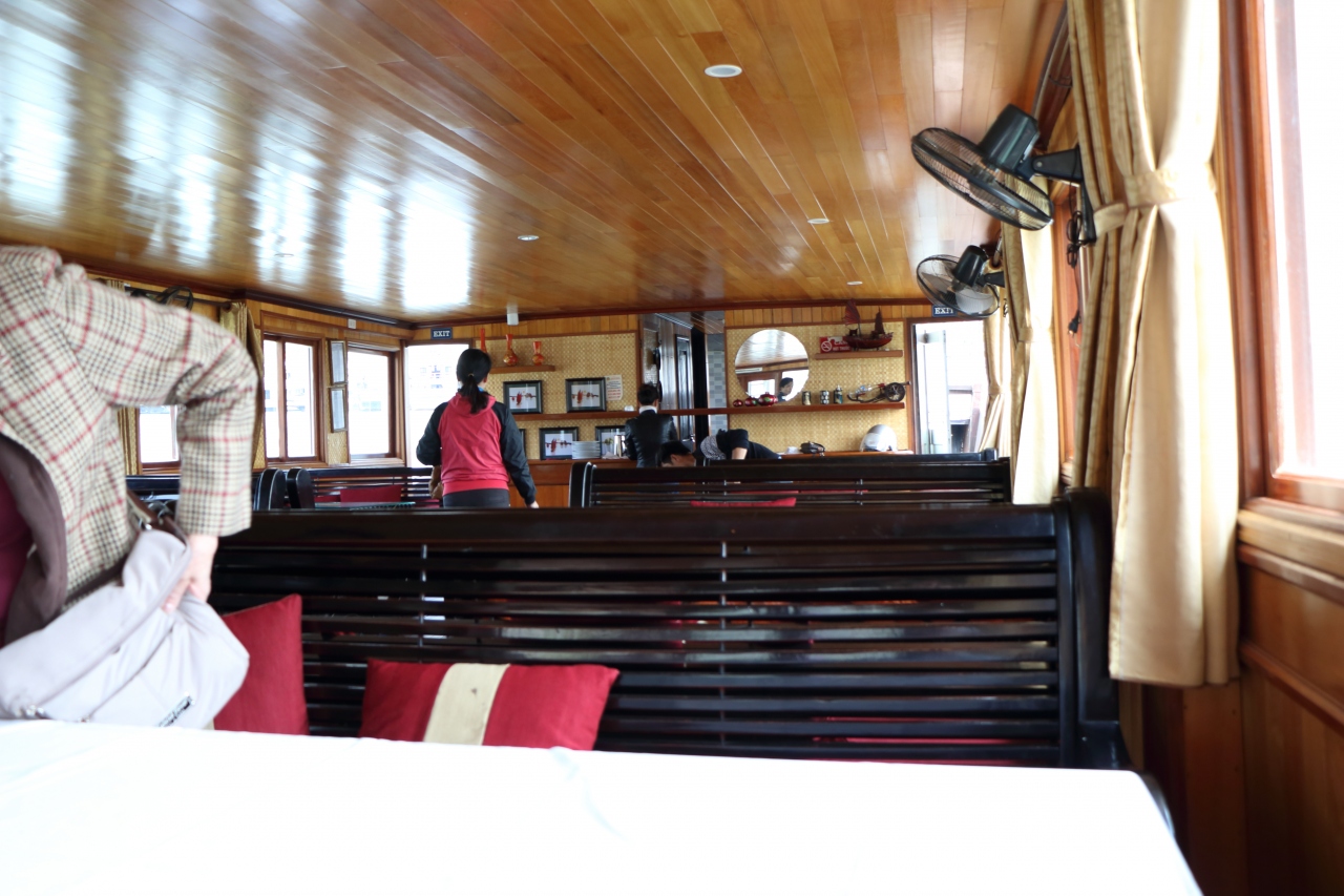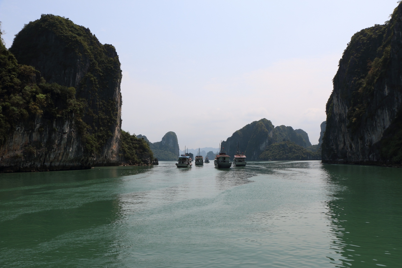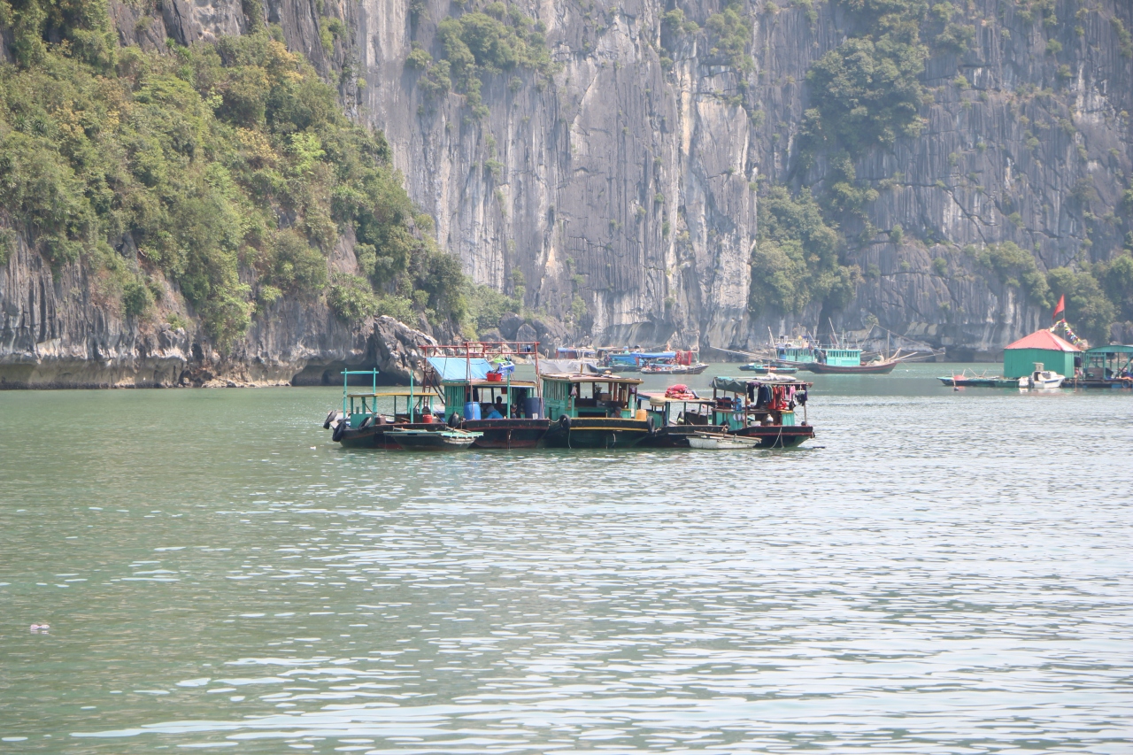 一度は行ってみたかったハロン湾です。龍が舞い降りたと伝わる湾です。松島のような感じと思っていましたが、とんでもないスケールが違います。半日のクルーズでほんの一部しか見ることができないほどの大きさで、2泊3日のクルーズもあるとのことでした。船に乗るとすぐに海鮮料理の昼食が始まります。景色を見るゆとりがないほどです。果物や海産物を売る船が寄ってきます。ガイドの話では、果物は新鮮でないのでよしたほうがいいとのことでした。シャコ、ハマグリ、カキなどを売りに来たので、シャコを買って、船で茹でてもらいました。日本のシャコの2倍はありそうな大きさです。値段は1つ500円(100000ドン)でした。友人は、日本では特別記念物の「カブトガニ」を値切って5000円で買って料理してもらいました。その後、鍾乳洞のある島に上陸して、鍾乳洞を見学して港に戻ります。食事もおいしいし、景色も最高です。