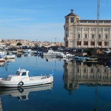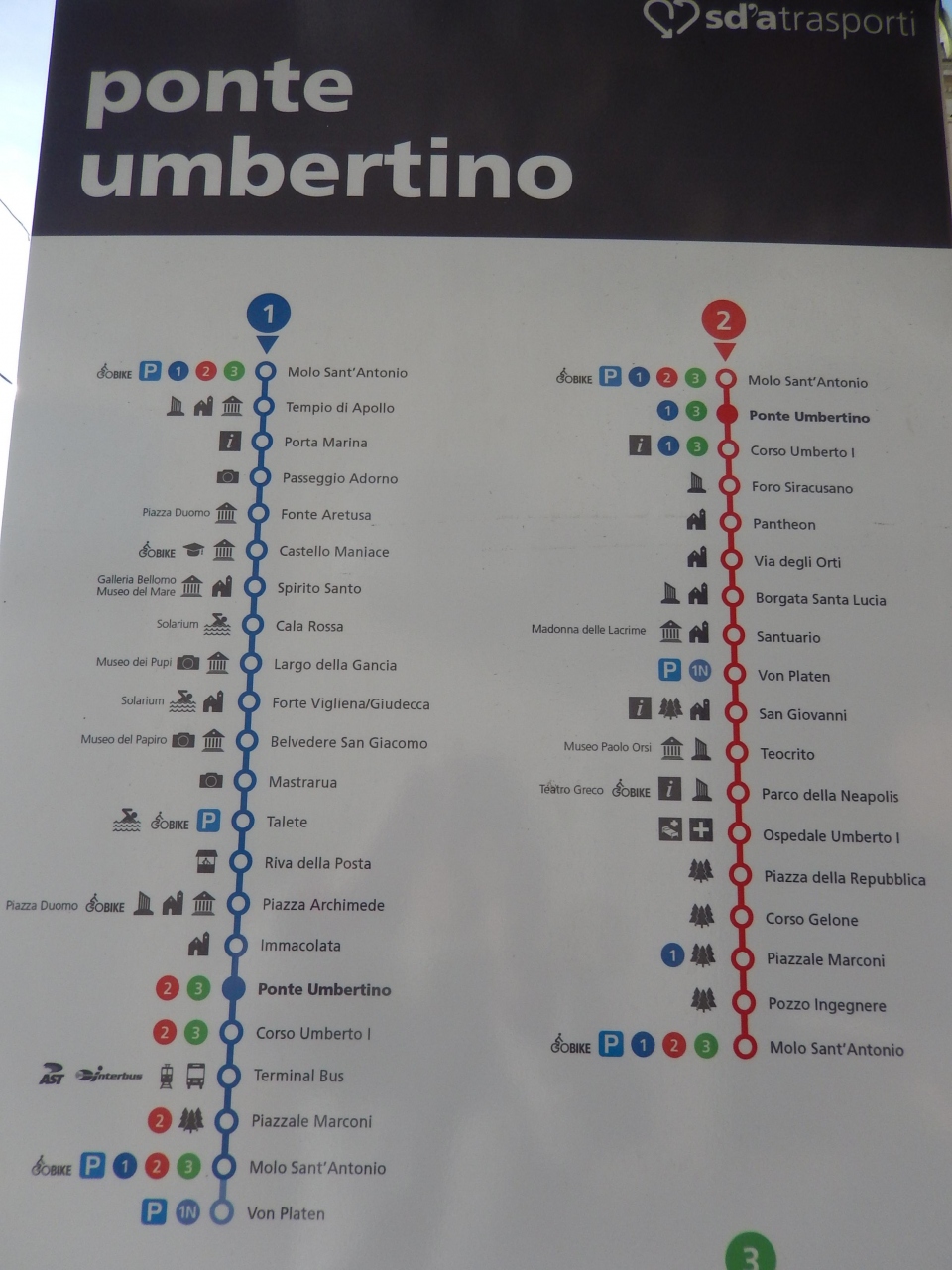 アポロ神殿から歩いて少し行くと、運河が見えてきます。そこにかかる小さい橋で、本島とオルディージャ島をつなぐ橋のひとつです。運河には船が停泊し、空も海も青くてのどかな雰囲気でした。橋を渡るとすぐバス停「Ponte Umbertino」があり、そこから考古学地区に移動しました。