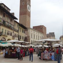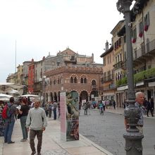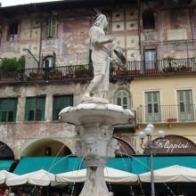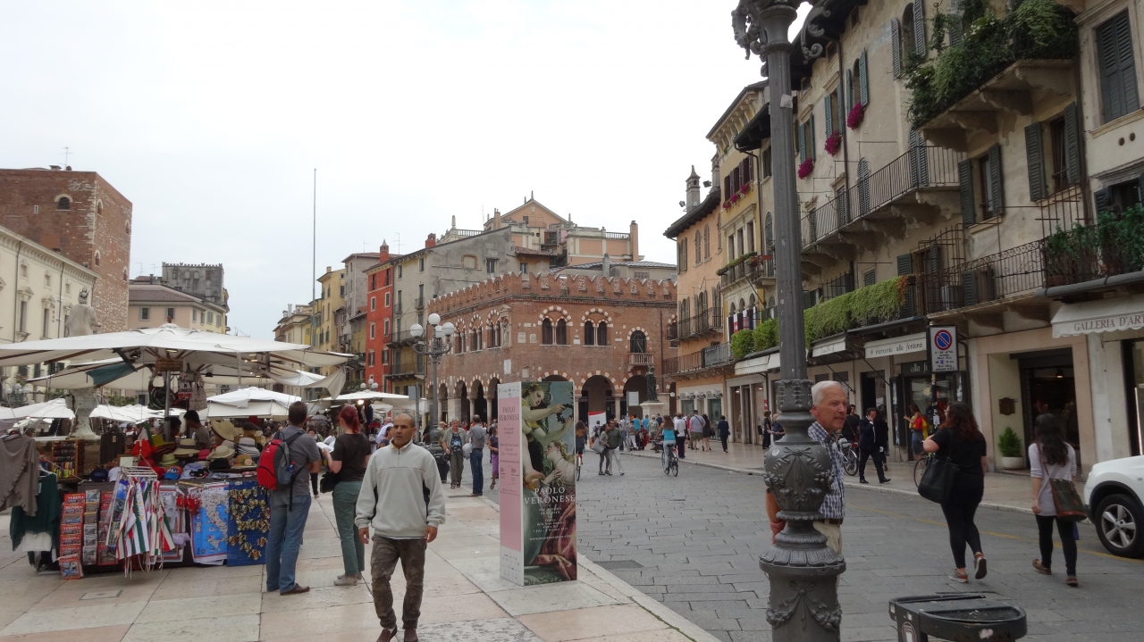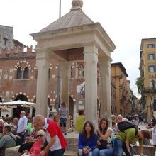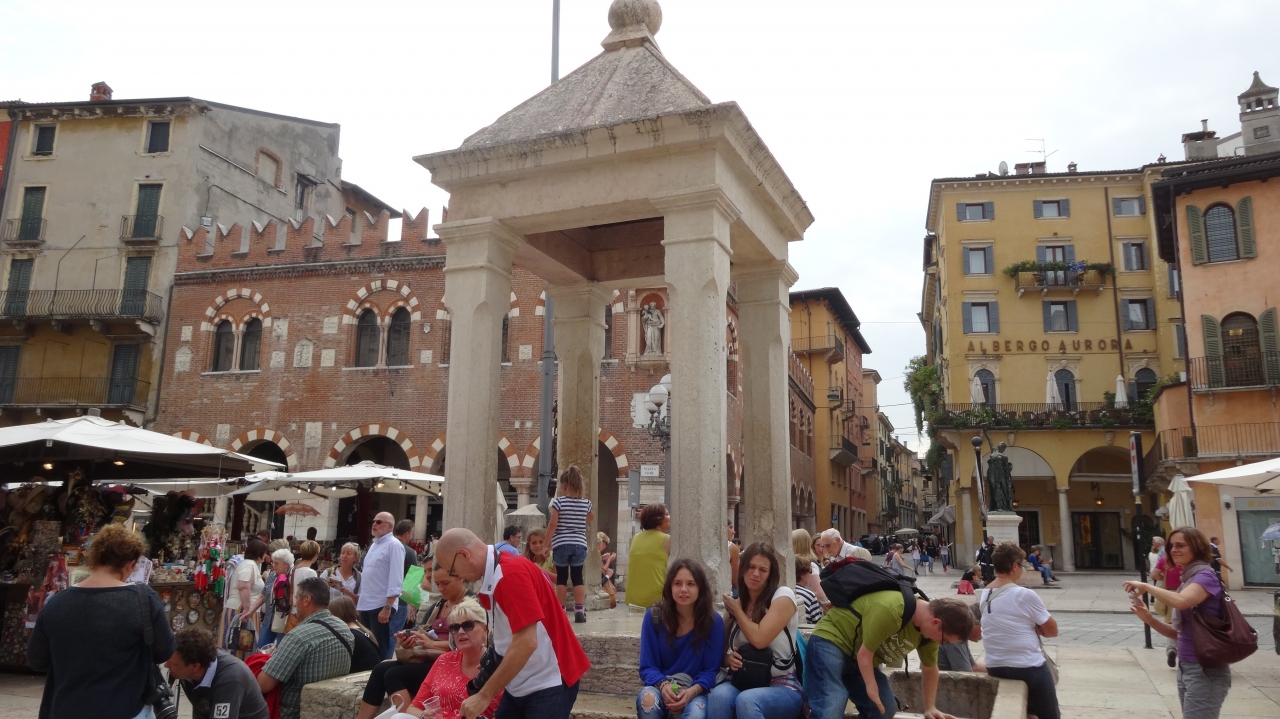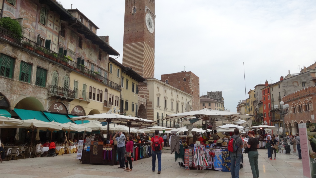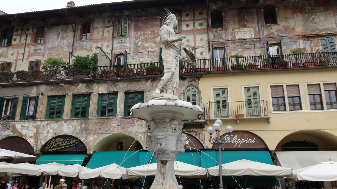 ベローナの観光スポットの中で最も美しい広場ということで行ってみました。ジュリエットの家からも近いです。広場には多くの白いパラソルのような屋根を持つ屋台が沢山並び、土産物を売っています。周りはカフェやBARで囲まれており、壁にはフレスコ画が書かれています。広場には有名なマドンナベレーナの噴水もあります。
