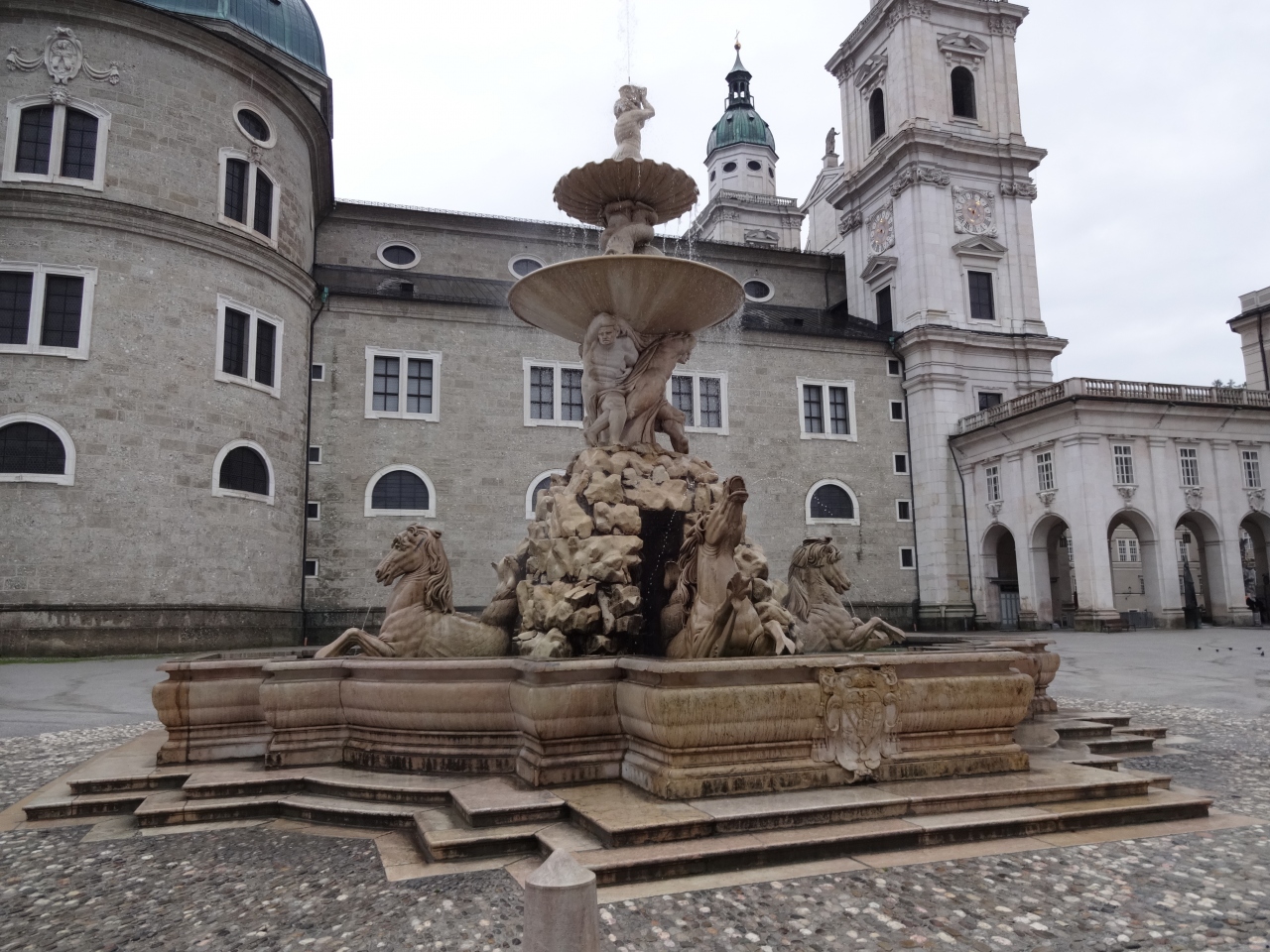 モーツァルト広場を町の中心に向かって抜けると、すぐ隣にはレジデンツ広場がある。ここには、サウンド・オブ・ミュージックにも出てきた噴水があり、レジデンツや大聖堂が取り囲んでいる。ここは、王の宮殿を凌ぐ贅を尽くした歴代のザルツブルクの大司教の宮殿。皇帝の間、騎士の間、戴冠の間、白の間などを見学。